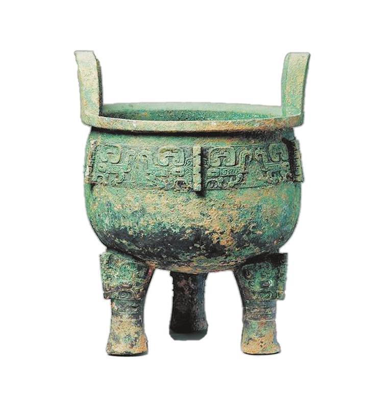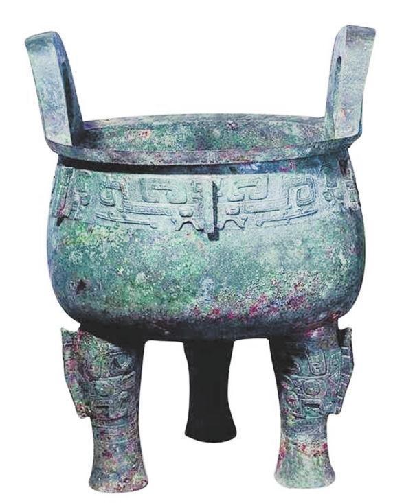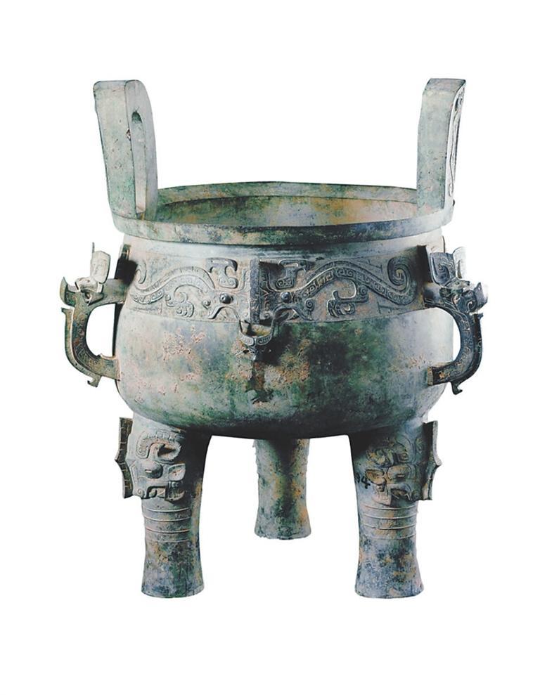 西周最大的圓鼎是陜西歷史博物館收藏的淳化大鼎,造型魁偉、深厚凝重,其造型基本保持了商代晚期胎壁寬厚、形體恢弘、凝重壯闊的風(fēng)格。大鼎通高122厘米,口徑83厘米,耳高28.6厘米,腹深54厘米,重226千克,是迄今世界上最大、最重的西周青銅器,也是迄今出土的西周圓鼎中最大者。淳化大鼎因體形太大太重,除口沿上有兩耳外,器身腰部亦有三耳,形如酒器中的銴。一般的鼎,大多只有口沿耳。淳化大鼎腰部三只獸首屈舌銴,為以往出土銅鼎所未見,故又名為獸首屈舌銴鼎、獸面紋五耳鼎。除了獨(dú)特的三耳,淳化大鼎腰部的龍紋和獸面紋的結(jié)合也很有特色。三面各有兩只夔龍,與中間的扉棱組合在一起看,則形成了一張由扉棱為鼻的獸面,即饕餮紋。三張獸面的扉棱下各有一只逼真的牛首浮雕,如同饕餮欲吞食牛,起威懾之用,所以也稱牛首夔龍紋鼎、龍紋鼎等。