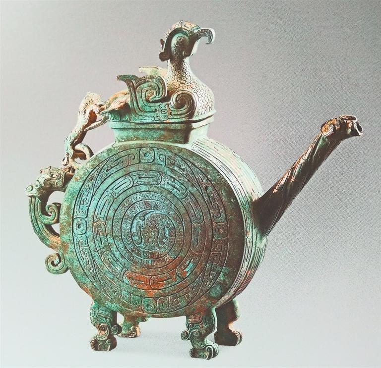 陜西寶雞出土的逨盉,酷似現(xiàn)代的扁圓形壺,器身呈扁圓形,長(zhǎng)方形口上有鳳鳥形蓋。鳳鳥引首高昂,喙微卷曲,振翼欲飛。器身與蓋用虎形鏈及雙環(huán)相連,虎作向上爬行狀,頭左偏而尾上卷。直管狀流,流端作龍首狀。鋬呈龍首向下噴水狀,下有四獸足。腹部?jī)蓚?cè)紋飾相同,分別由三圈組成,由外向內(nèi)依次為變體夔龍紋、重環(huán)紋和蟠龍紋。逨盉是祭祀禮器,它將天上飛的鳳鳥、地上跑的猛虎、水里游的蛟龍,作為溝通天地、人神的使者,使天地人三者合而為一。由于周人將動(dòng)物視為具有無(wú)限神力之神靈,因此青銅器上之動(dòng)物紋樣,除宗教祭祀意涵外,也富有一定的政治意義。貴族通過(guò)青銅器上神秘肅穆的動(dòng)物紋樣,令人望之崇敬生畏,以威嚇被統(tǒng)治者,達(dá)到鞏固本身地位及權(quán)威之目的,同時(shí)也含有龍騰虎躍鳳呈祥的美好寓意。