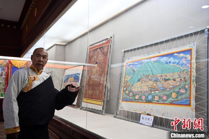 圖為交巴加布展示以拉卜楞寺為主題的唐卡作品。交巴加布不僅繼承了傳統(tǒng)唐卡技藝,更在創(chuàng)新中展現(xiàn)了個(gè)人特色。他結(jié)合現(xiàn)代審美和繪畫技巧,使作品既保留了傳統(tǒng)的韻味,又具有鮮明的現(xiàn)代氣息。這種獨(dú)特的藝術(shù)風(fēng)格使他的作品在眾多唐卡中脫穎而出,成為藏族民眾和藝術(shù)愛好者爭(zhēng)相收藏的藝術(shù)珍品。九美旦增 攝