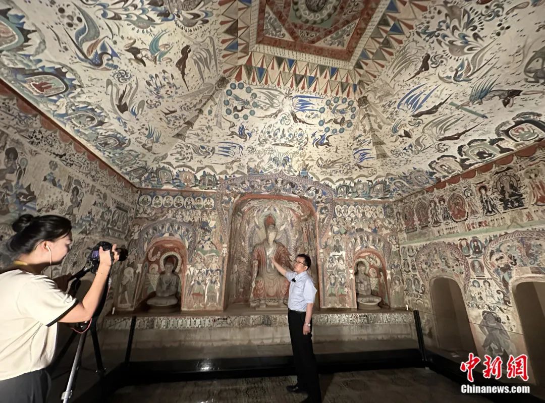 2023年7月,敦煌研究院副院長(zhǎng)張?jiān)衷诙鼗湍呖叩?85窟原大復(fù)制窟內(nèi),接受中新社“東西問(wèn)”獨(dú)家專(zhuān)訪(fǎng)。丁思 攝