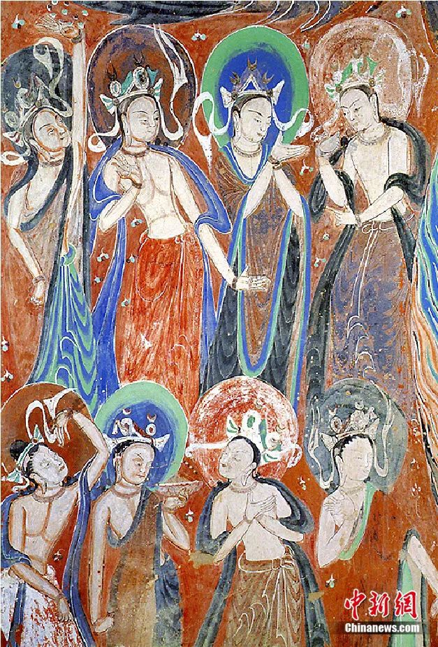 張?jiān)郑憾鼗捅诋?huà)中,有中國(guó)傳統(tǒng)神話(huà)中的神靈形象,如東王公、西王母、菩薩、觀音、伏羲、女?huà)z、雷公,以及青龍、白虎、朱雀、玄武等祥瑞動(dòng)物和異獸形象;也有來(lái)自印度—西域典型的神靈形象,有阿修羅、迦樓羅(金翅鳥(niǎo)王)、緊那羅(樂(lè)天)、大蟒神等等。除印度佛教及其藝術(shù)影響外,具有波斯—中亞藝術(shù)典型特色的連珠紋、對(duì)鳥(niǎo)對(duì)獸紋在敦煌壁畫(huà)中也非常流行;壁畫(huà)人物頭飾“三面寶冠”上裝飾的月形、日月形飾物題材,來(lái)源于薩珊波斯。又如北朝時(shí)期敦煌壁畫(huà)中的人物造型風(fēng)格,既有西域式的“龜茲風(fēng)”,又有來(lái)自中原、南朝的“褒衣博帶”“秀骨清像”式。