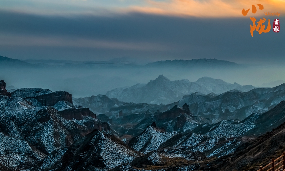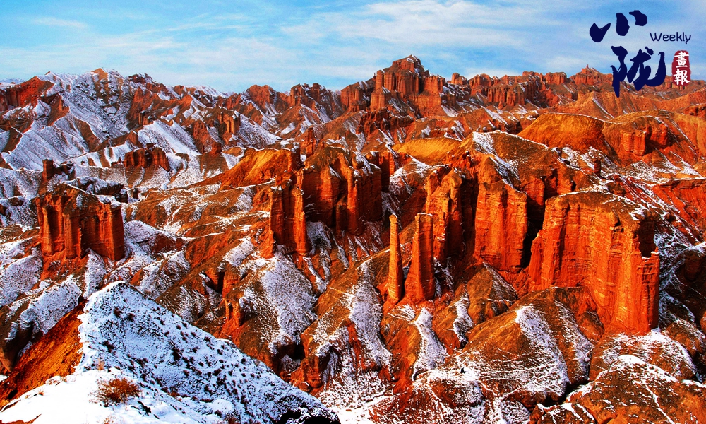 雪后,赤紅色的丘陵充滿陽剛之美,白雪宛如輕紗浸在丹霞山上,顯得格外艷麗多彩、如夢如幻。