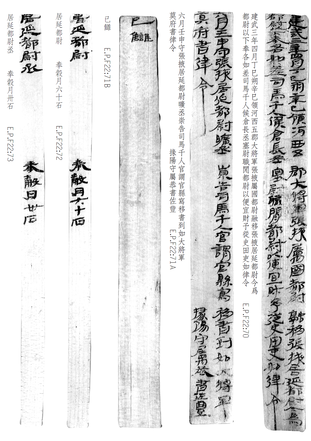 1974年8月出土于甲渠候官遺址第22號房址內(nèi)。簡冊由10枚簡組成,每簡長22.8厘米,前兩簡寬2.5厘米,其余8簡寬1.4厘米。全文200字。內(nèi)容為東漢建武三年(公元25年)竇融統(tǒng)治河西期間留下的一份完整的財政文書。簡文是關(guān)于居延都尉府吏員奉谷標(biāo)準(zhǔn)的通知,由領(lǐng)河西五郡大將軍張掖屬國都尉竇融幕府下發(fā),簡言“如律令”可知其指令具有法律效力。