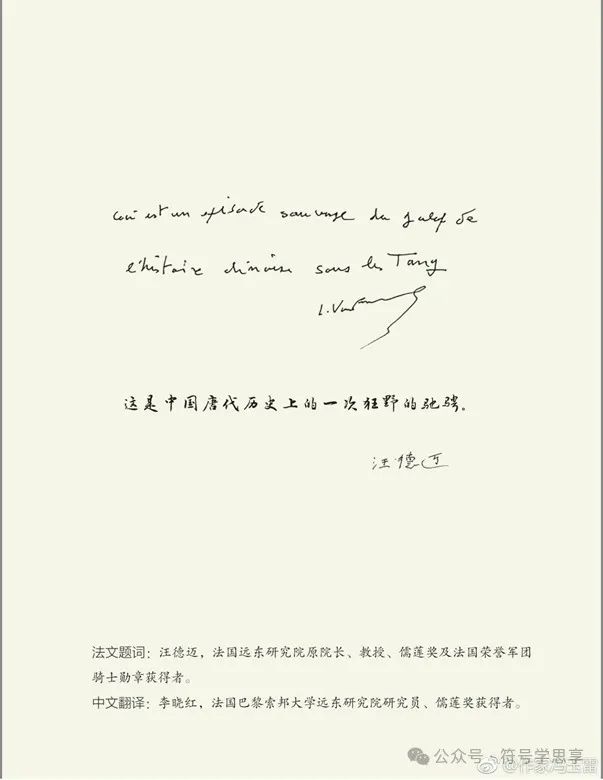 汪德邁先生對于馮玉雷這部作品給予高度評價(jià),2018年專門題辭:“這是中國唐代歷史上的一次狂野的馳騁。”馮教授專門把汪德邁先生給他的法文與中文題辭作為題簽印在書封面上,他多次跟我說:“幸遇汪德邁教授、李曉紅教授,受益良多,感激之情,難以言表。”