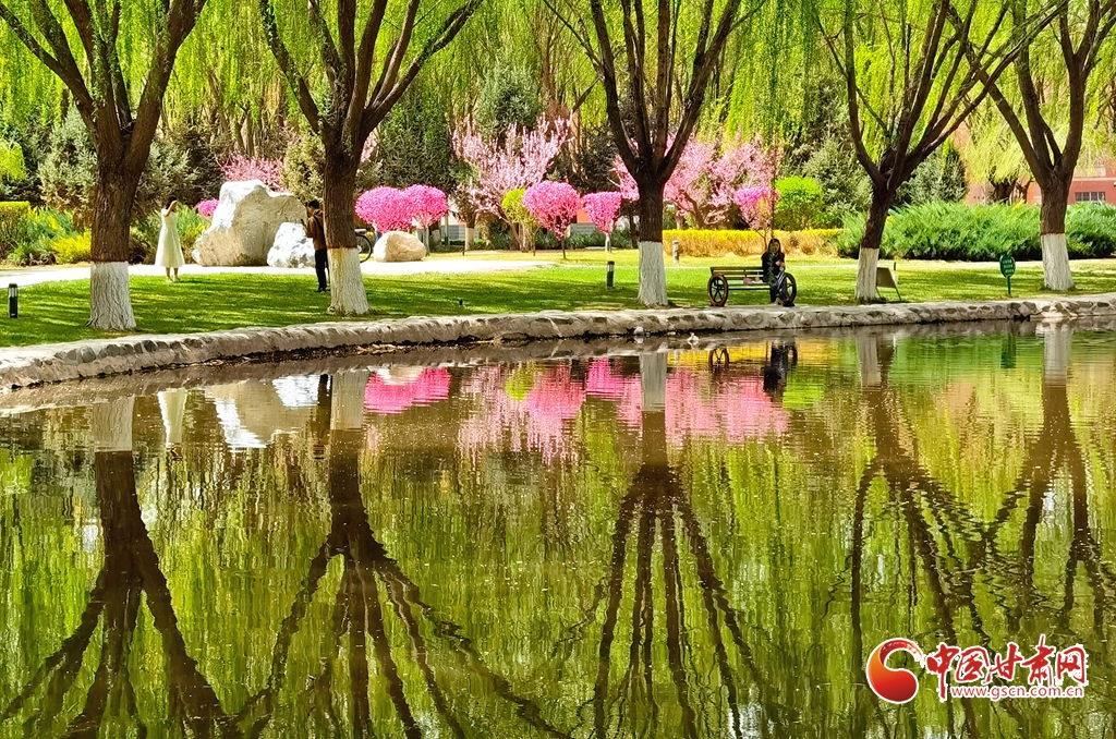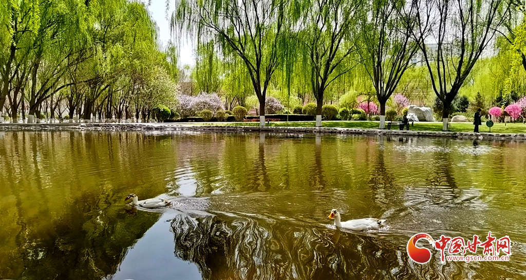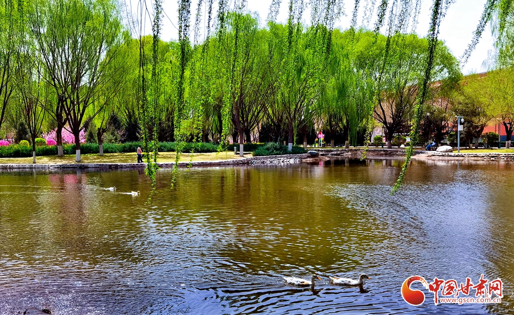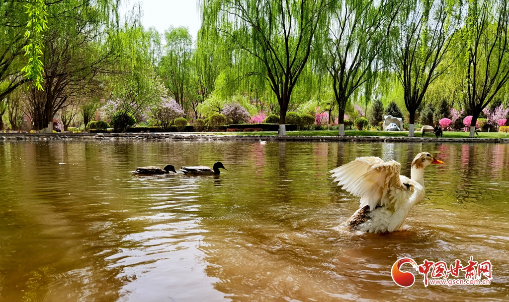 4月14日清晨,位于甘肅省張掖市河西學(xué)院的明理湖畔,春風(fēng)拂柳,鴨子嬉戲,空氣中不時(shí)飄來(lái)花香縷縷,到處一派春意盎然的美景。