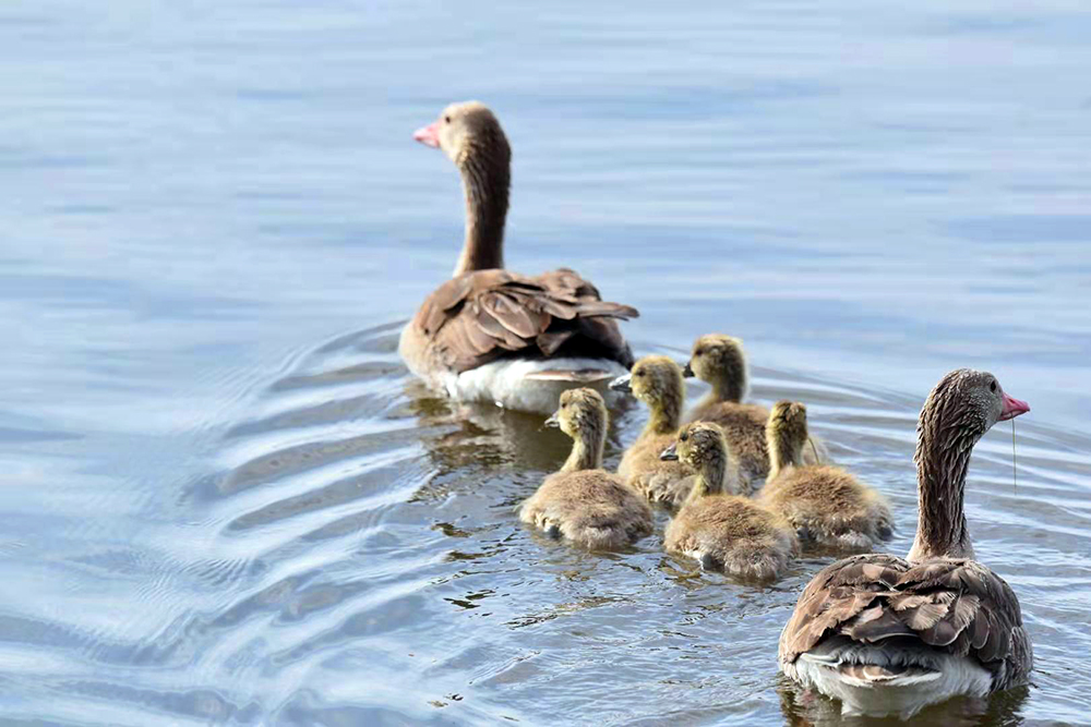 灰雁是鴨科雁屬鳥類,屬國家重點(diǎn)保護(hù)的“三有”鳥類,也是陽關(guān)濕地的夏候鳥。監(jiān)測(cè)顯示,在陽關(guān)濕地繁殖的灰雁家族有100多只。每年3月下旬遷飛至陽關(guān)濕地,4月中旬筑巢繁殖,5月上旬孵化出雛鳥4至5只。灰雁為“一夫一妻”制,孵化由雌鳥單獨(dú)承擔(dān),雄鳥在巢附近負(fù)責(zé)警戒。待雛鳥破殼出窩后,則由雌雄共同撫育?;已闵阅懶?、機(jī)警,小寶寶溜達(dá)時(shí),雌鳥在前開道,雄鳥負(fù)責(zé)斷后,小寶寶上岸覓食嫩草芽時(shí),雄鳥仍然負(fù)責(zé)警戒,若有危險(xiǎn)立刻鳴叫警示。故而,近距離拍攝灰雁雛鳥是比較困難的。
