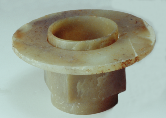 這些玉器長(zhǎng)期以來(lái)被認(rèn)為是西周器物,但從材質(zhì)到不規(guī)則的形制及雕琢工藝特征觀察,無(wú)疑是齊家文化的器物。它們雖然不能套疊使用,但可配對(duì)組合。現(xiàn)藏寶雞市鳳翔區(qū)博物館。