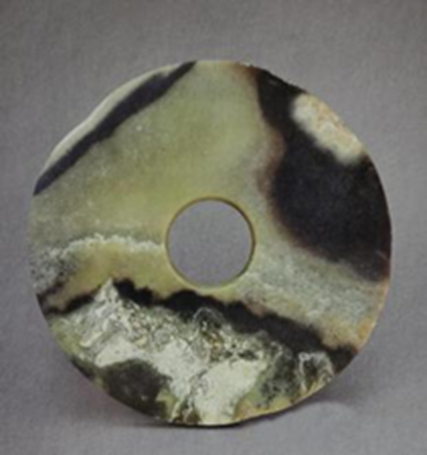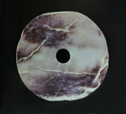 玉璧(編號(hào)總0129:5)直經(jīng)9厘米,單面鉆孔,大端孔徑4.4厘米,小端孔徑4厘米,厚度0.55—0.7厘米,璧外緣有磕碰痕。