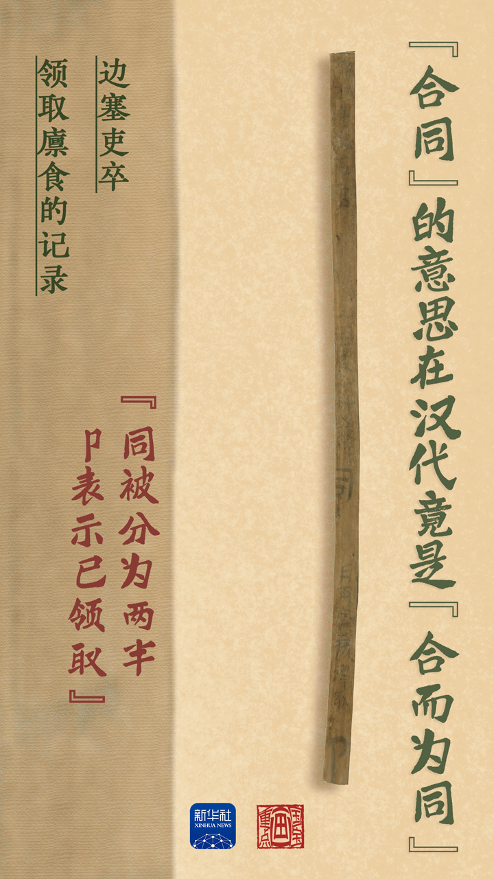 漢代人在簡牘上書寫一個“同”字,從中間一分為二,由雙方當(dāng)事人各執(zhí)一半。需要核驗時,雙方將所執(zhí)半簡合在一起,這樣就能拼成一個完整的“同”字?;蛟S,這就是現(xiàn)代“合同”的來歷。