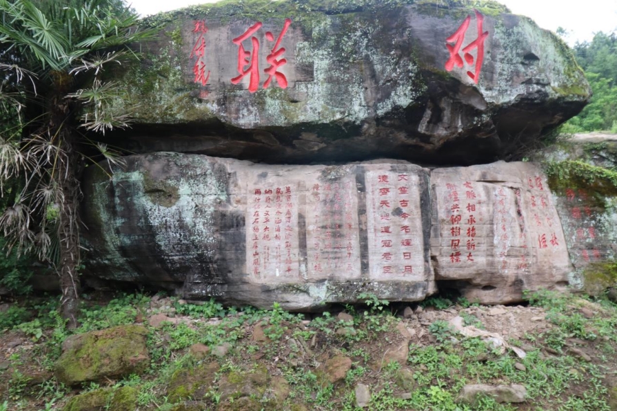 山上隨處是石,或臥或立,俱有雄獅虎豹之勢;或平或峻,皆作岡陵之態(tài)。青峰續(xù)脈,絕頂鷹飛。鑿巖壁以造法像,栩栩如臨宮闕;摩巨石而鐫嘉聯(lián),文華直射牛斗。石多瑰偉,苔覆璞瑜,油菜花點(diǎn)綴其間,引來蜜蜂蝴蝶共舞。山茶與毛竹同畦,郁郁蔥蔥;峰巒與云煙共養(yǎng),莽莽蒼蒼。遇目石上鐫字,瀏賞翰墨煙霞;振藻揚(yáng)毫,皆寰中俊杰;椽筆斯文,多隴蜀賢達(dá)?;虺嘧痈文懀瑺T照于史;或凜然浩氣,嘯傲大千。聯(lián)壁生輝,文曲星彰;峣巖開竅,氣通神明。文采煥然與星河同輝,詩儕競秀潤厚山玉顏。壯懷詩夢,漱玉溪流。在一塊巨石斜面上,有同伴發(fā)現(xiàn)刻有筆者所書長聯(lián),興奮得喊叫起來。這是三年前應(yīng)曹興章先生之約而作,聯(lián)曰:翰墨生輝,千秋勝景開仙境;源泉流韻,萬象韶光耀厚山。我用手指扣去筆畫生出的茂密青苔,坐下來與我的聯(lián)合影留念。信是蓮花開石上,遙遙至此結(jié)仙緣。
