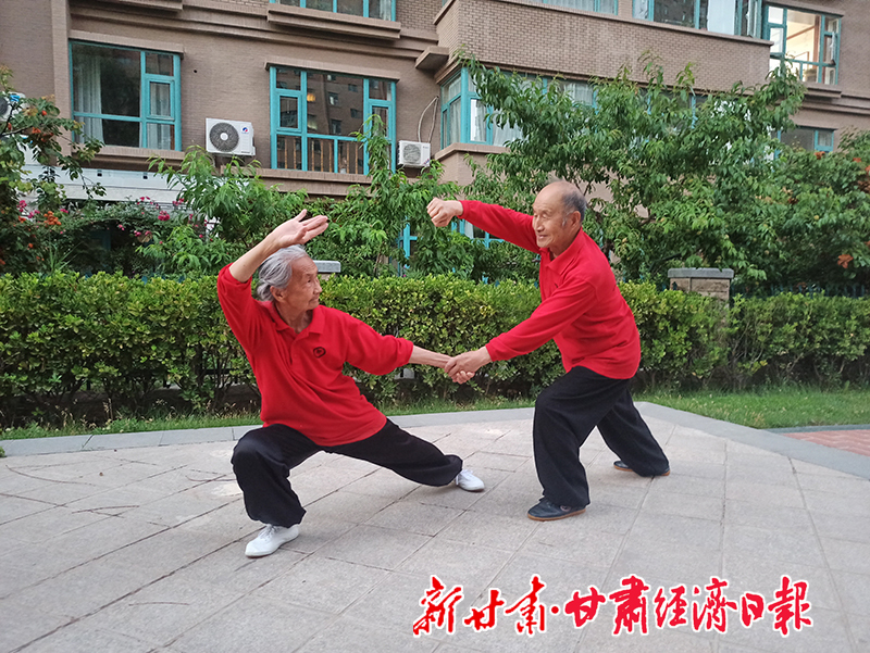 崆峒山下,綠地廣場,90歲的岳起中和87歲的張煒英帶領一眾弟子以颯爽的英姿、矯健的步履完成了一套崆峒太極拳。