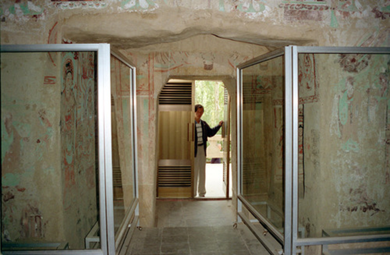 圖為莫高窟的367個(gè)洞窟安裝了鋁合金窟門,并在94個(gè)開放的洞窟安裝了玻璃屏風(fēng),即保護(hù)了壁畫的彩塑,又不影響參觀者視線。新華社記者彭張青攝(1996年11月24日發(fā))