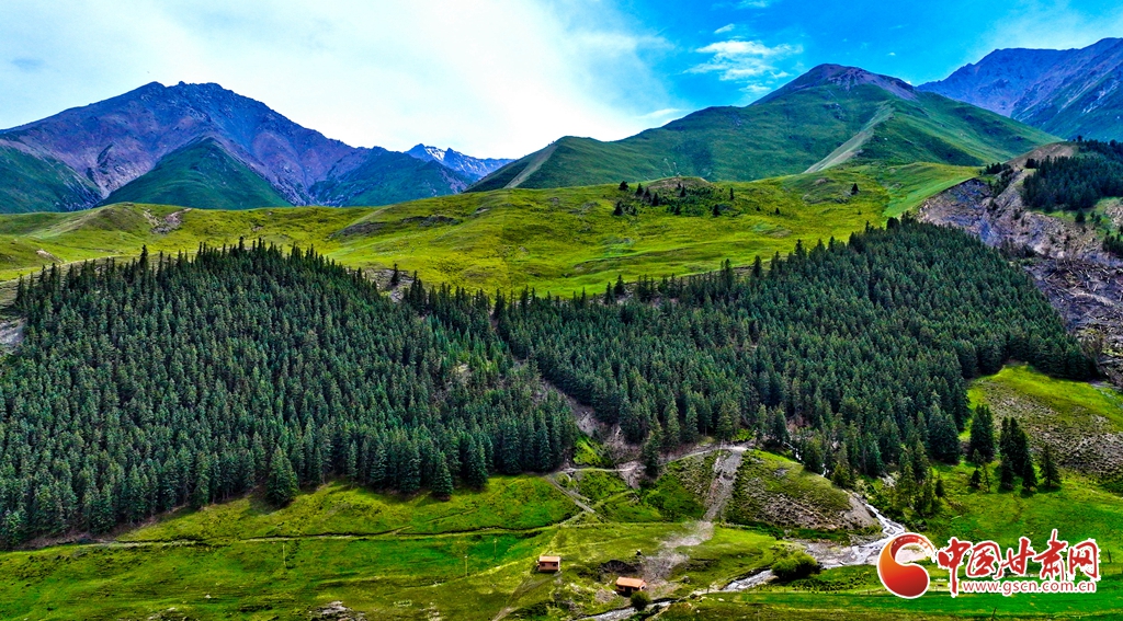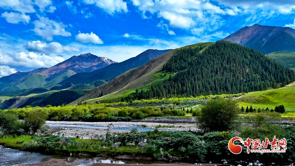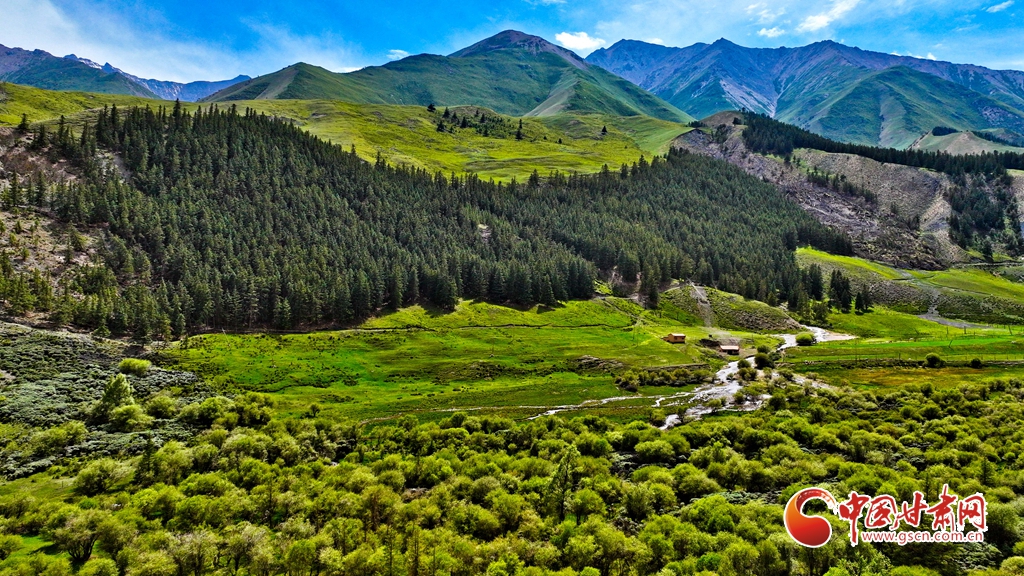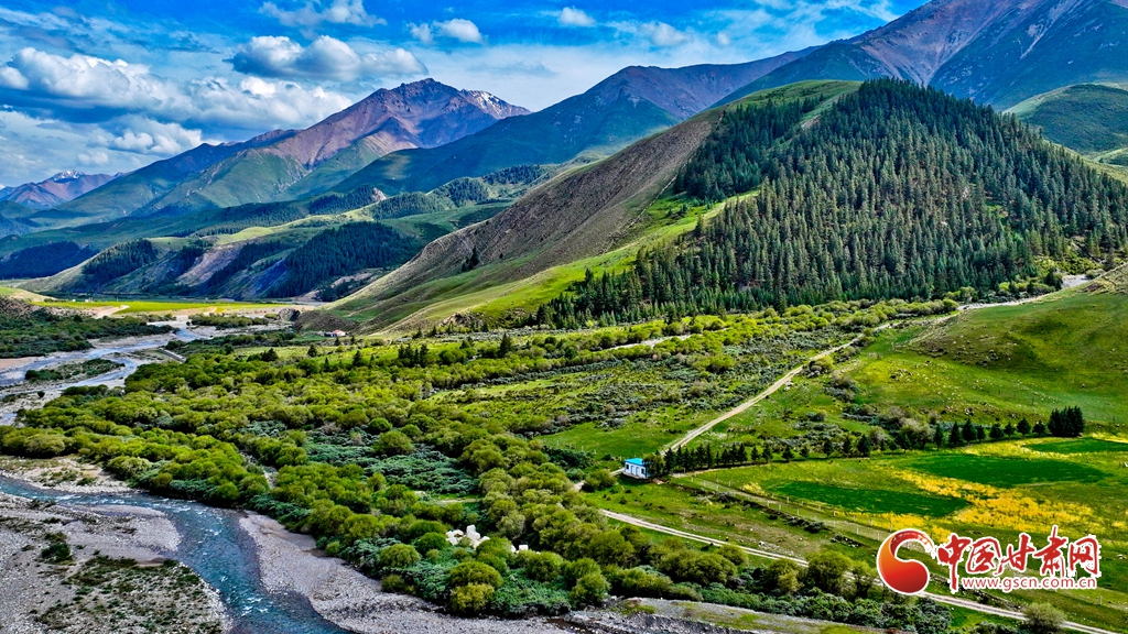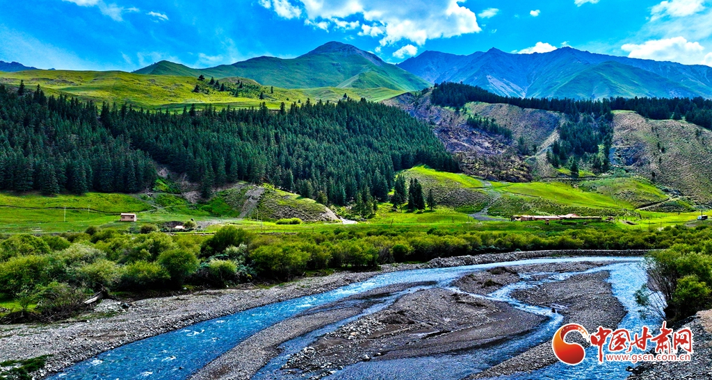 7月2日,祁連山國家公園甘肅省張掖市肅南裕固族自治縣大河鄉(xiāng)段,在高原藍天白云映襯下,群山環(huán)抱、 雪峰高聳,鳥鳴聲陣陣的濕地、奔騰不歇的黑河水、猶如“巨幅綠毯”的草原,勾勒出一幅風(fēng)光壯美的生態(tài)畫卷。