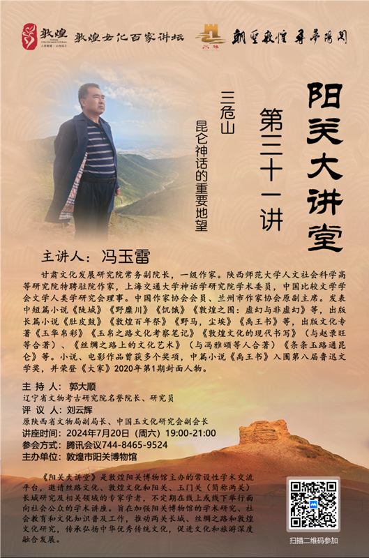 中國(guó)甘肅網(wǎng)7月18日訊 7月20日,西北師范大學(xué)甘肅文化發(fā)展研究院常務(wù)副院長(zhǎng)、一級(jí)作家、玉文化學(xué)者馮玉雷將在線進(jìn)行題為《三危山:昆侖神話的重要地望》的講座。本次講座由敦煌陽(yáng)關(guān)博物館主辦,為“敦煌文化百家講壇”第31講,遼寧省文物考古研究院名譽(yù)院長(zhǎng)、資深考古學(xué)家、玉學(xué)家郭大順研究員擔(dān)綱主持,陜西省文物局原副局長(zhǎng)、中國(guó)玉文化研究會(huì)副會(huì)長(zhǎng)、資深玉學(xué)家劉云輝教授擔(dān)綱評(píng)議。