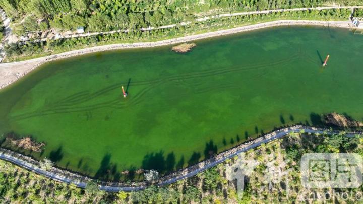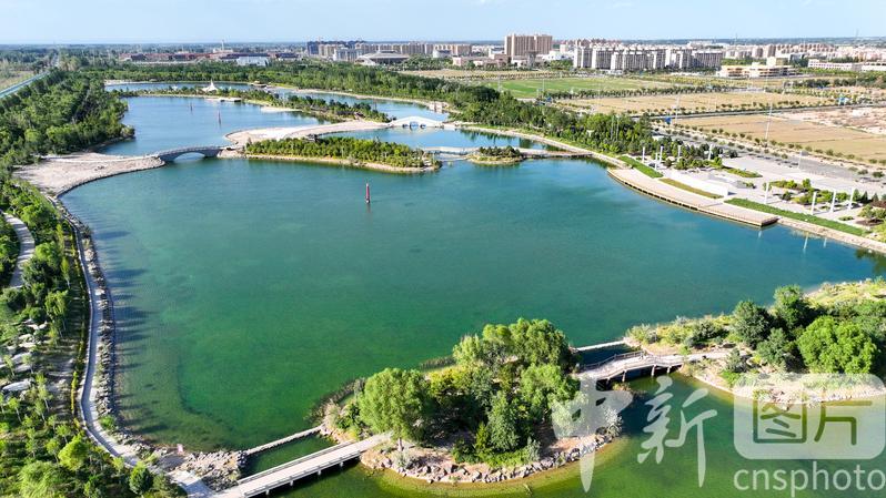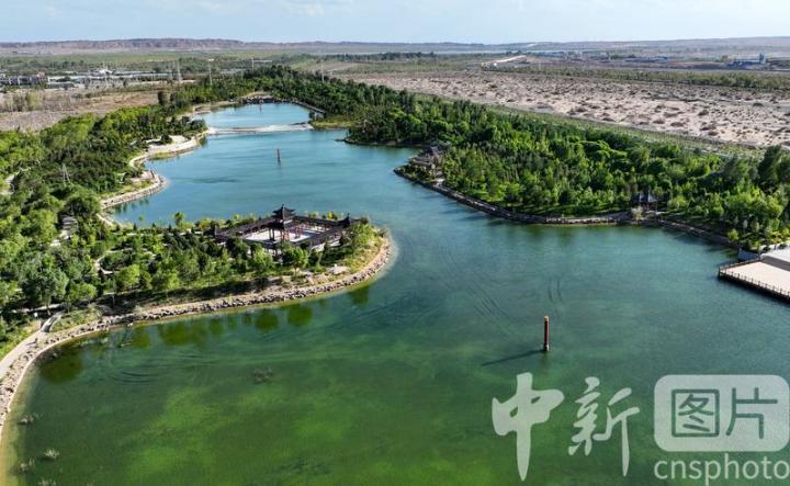 2024年7月27日,航拍甘肅省酒泉市金塔縣城西生態(tài)湖,綠意盎然,生機(jī)勃勃,構(gòu)成了“戈壁水鄉(xiāng)”的獨(dú)特畫卷。中新社發(fā) 曹紅祖 攝