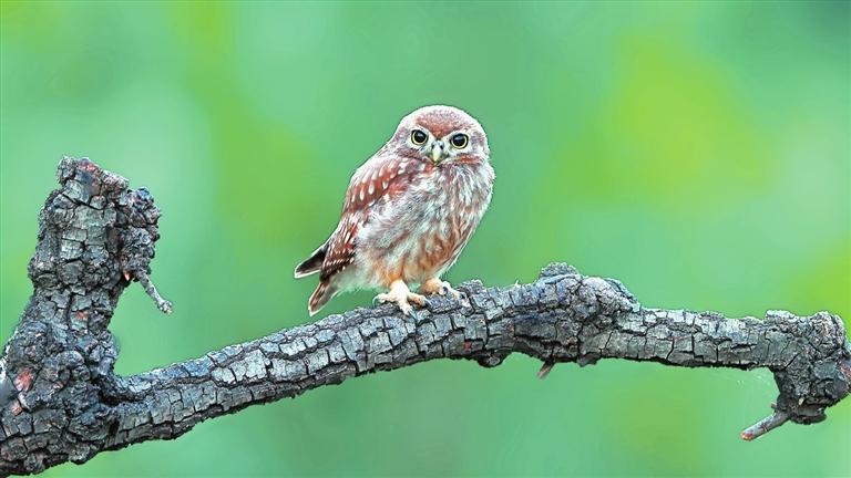 我近距離地看著這小小的、聰慧的鳥兒。它的上體是棕黃色的,散布著許多白點(diǎn),頭上的白點(diǎn)比身上的更加細(xì)密。貓頭鷹脖子的轉(zhuǎn)動極限大約是270度,能水平轉(zhuǎn),也能上下轉(zhuǎn),這個(gè)“超能力”讓眼前的小家伙能更靈活機(jī)敏地打量我。它的眼周有一圈兒顯眼的白色,于喙的上方幾乎相連,變成兩道白色的眉毛,平添了幾分威武。