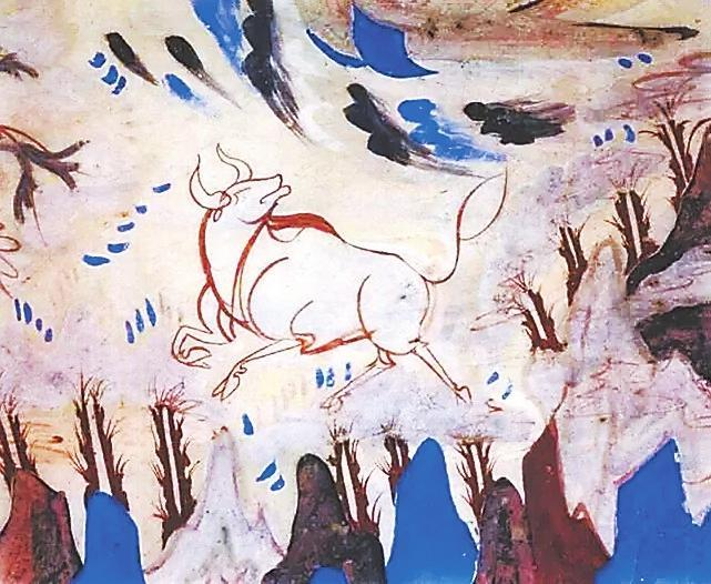 在莫高窟第454窟壁畫中有一幅“耕牛圖”:畫面刻畫了一頭正在勞作的耕牛。畫師用土黃色作為畫面的主色調(diào),將正在馭牛的人只是寥寥數(shù)筆勾勒其形體而已,卻用了醒目的赭紅色來表現(xiàn)一頭牛正在使盡全身力氣耕耘的形象。透過畫面我們能感知到這是一頭“不待揚(yáng)鞭自奮蹄”的老黃牛。除了描繪在農(nóng)耕生活中勤勤懇懇的耕牛,敦煌壁畫中還描繪了其他形形色色的牛。在莫高窟第249窟壁畫中有一幅“受驚的野牛圖”,畫面上刻畫了一群在山林間閑庭信步的野牛,它們神色安詳自若。忽然一只矯健的猛獸疾馳而至,其中一頭牛受驚回首。這些均被技藝精湛的畫師惟妙惟肖生動勾勒而出。我們看到一只肌肉健碩、神態(tài)生動的野牛幾乎要從壁畫中呼之欲出,令人唯恐避之不及。還有在莫高窟第61窟壁畫中有一幅“金牛宮圖”,這是“黃道十二宮”中的其中一幅圖。所謂的“黃道十二宮”就是今天所說的十二星座,畫面中的金牛體態(tài)豐滿,神態(tài)安詳,牛的敦厚忠誠、樸實(shí)溫馴、勤勉勞作、默默無聞的精神贏得了人們的信任。