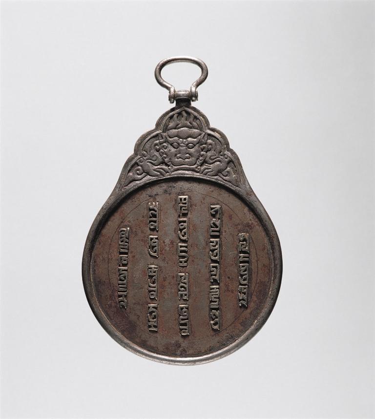 八思巴文虎頭銀符鐵牌,元代,符牌兩面鑲嵌八思巴文銀字,譯為“上天眷命,皇帝聖旨:如不欽奉虔敬,治罪”。廓外上有葉狀鈕座,座內(nèi)鑄虎頭紋,座頂有橢圓形環(huán)鈕。這種虎符圓牌專為傳遞“軍情急務(wù)”而設(shè),持之可進出全國各地及四大汗國,域跨歐亞,故有“國際通行證”之稱,是研究元代急遞制度以及政治史、民族文字等方面的珍貴實物資料。這種符牌使用范圍十分嚴格,故全世界現(xiàn)存數(shù)量極少。