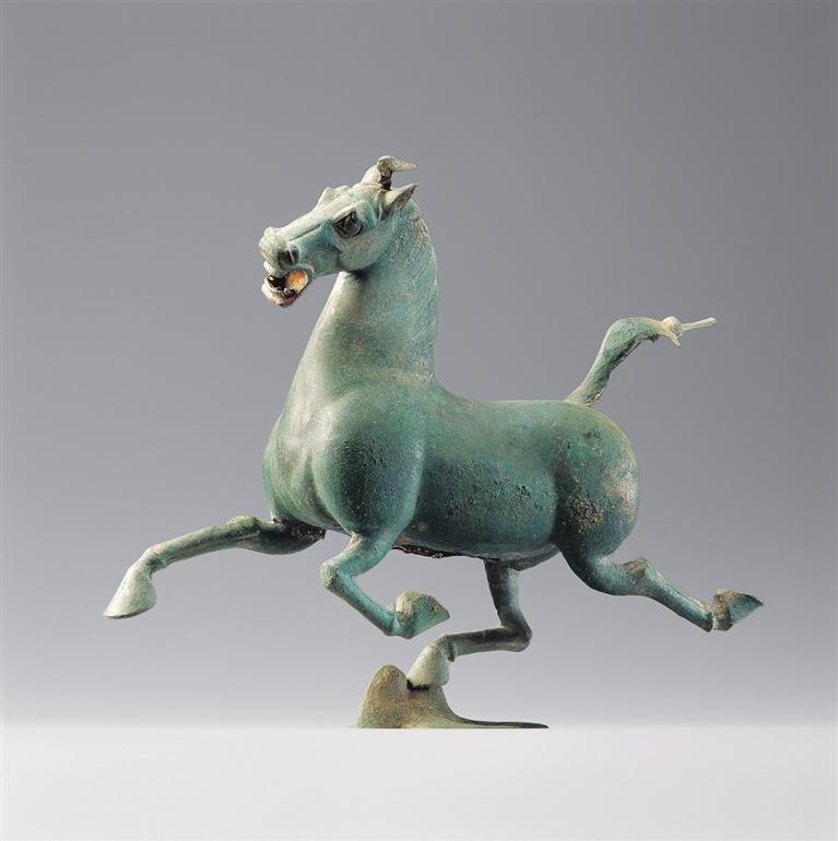 銅奔馬,東漢,1969年武威市雷臺墓出土。馬作奔騰狀,三足騰空,右后蹄踏一展翅飛翔、回首驚顧的飛鳥。奔馬全身著力點集于超掠飛鳥的一足之上,準確地把握了力學(xué)平衡。蹄踏飛鳥,表現(xiàn)出馬行迅疾,在鳥驚回首的剎那已經(jīng)超越了飛行的鳥。銅奔馬鑄造精美,構(gòu)思巧妙,為我國青銅藝術(shù)中罕見的杰作,1983年被確定為中國旅游標志,2002年被國家文物局列入首批禁止出國(境)展覽文物目錄。它以卓絕的藝術(shù)造詣千古生輝,成為中華民族勇往直前、積極進取偉大氣質(zhì)的象征。