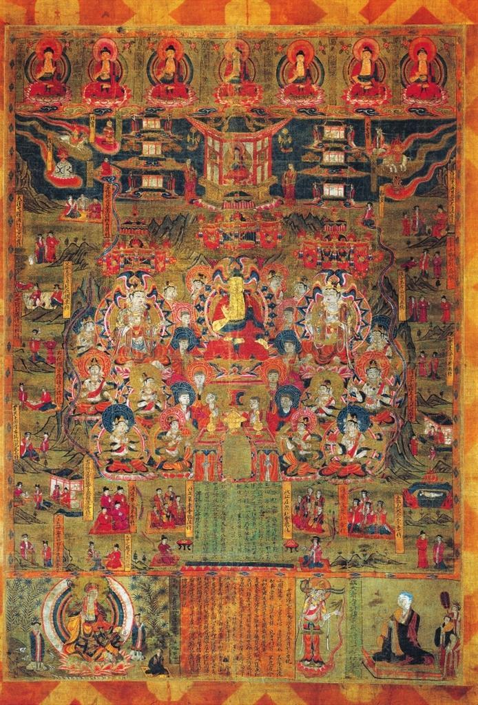 該畫為絹地設(shè)色,出自敦煌莫高窟藏經(jīng)洞。畫面中心為說法圖,一佛二菩薩法相莊嚴,諸菩薩、弟子、比丘、比丘尼、優(yōu)婆塞、優(yōu)婆夷等“赴會圣眾”圍繞周圍。兩側(cè)及上方分布15幅經(jīng)變故事圖,以連環(huán)畫形式鋪陳展現(xiàn)《佛說父母恩重經(jīng)》的基本內(nèi)容。其上繪七佛、彌勒與七寶,其下墨書《佛說報父母恩重經(jīng)變》。絹畫最下方自左向右排布地藏菩薩、《繪佛邈真紀》、引路菩薩及比丘尼戒行邈真像。該絹畫保存完整,色彩絢麗,是敦煌《佛說父母恩重經(jīng)》諸變相中,內(nèi)容最復(fù)雜,畫面情節(jié)最多,特點最鮮明,風(fēng)格最獨特的一幅,且有宋淳化二年(公元991年)明確紀年,具有重要的歷史、藝術(shù)和研究價值。
