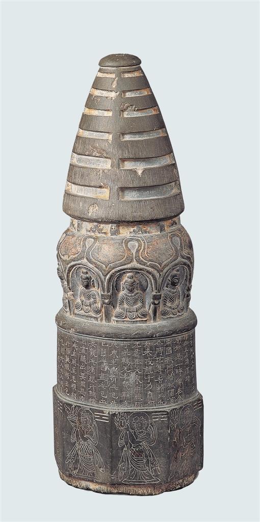 高善穆石造像塔,1969年甘肅省酒泉市出土。寶蓋、相輪、塔頸、塔肩、塔基一應(yīng)俱全,底部有榫頭。寶蓋頂端中間刻北斗七星,塔腹陰刻《增一阿含經(jīng)·結(jié)禁品》的前半部分及發(fā)愿文,有承玄元年(公元428年)紀年。塔基為八面形,每面陰刻一像,像左側(cè)上方刻八卦符號。該造像塔是現(xiàn)存北涼石塔中保存最完整的一件,在造型上繼承了犍陀羅供養(yǎng)小塔的基本造型特征,又有了新的發(fā)展,如塔頂端的北斗七星,塔基的八卦符號等,體現(xiàn)出佛教文化和中國本土文化之間的碰撞和融合,是研究早期佛教藝術(shù)和佛教思想的重要標本。