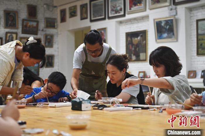 8月20日,甘肅敦煌莫高里工匠村內,學員體驗敦煌文化研學課程。工匠村開設了泥板畫、彩繪、雕塑制作、剪紙、農耕體驗等課程,現(xiàn)已發(fā)展成為一個集敦煌文化講堂、壁畫書法研習、美術設計、彩塑制作教學、篆刻藝術、傳統(tǒng)釀酒體驗、農業(yè)產(chǎn)業(yè)發(fā)展等于一體的多功能實訓基地。中新社記者 李亞龍 攝