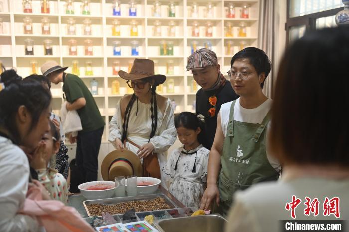 8月20日,甘肅敦煌莫高里工匠村內,研學導師向學員介紹敦煌礦物質顏料。工匠村開設了泥板畫、彩繪、雕塑制作、剪紙、農耕體驗等課程,現(xiàn)已發(fā)展成為一個集敦煌文化講堂、壁畫書法研習、美術設計、彩塑制作教學、篆刻藝術、傳統(tǒng)釀酒體驗、農業(yè)產(chǎn)業(yè)發(fā)展等于一體的多功能實訓基地。中新社記者 李亞龍 攝