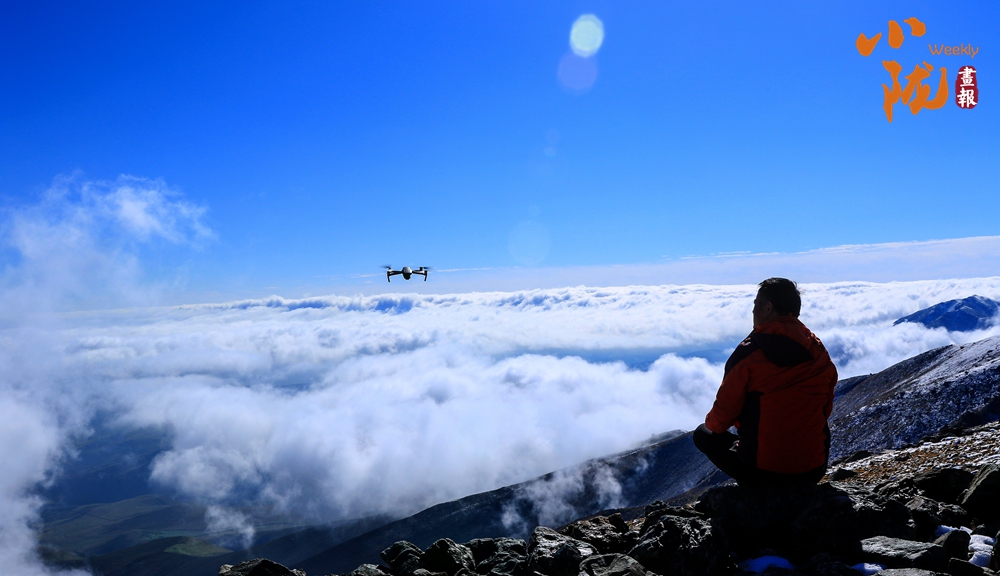 雪山山巒間,云霧回旋飄動(dòng),彌漫舒展,如海浪起伏、波濤滾滾一般,與湛藍(lán)天空相互映襯,壯美如畫(huà)。