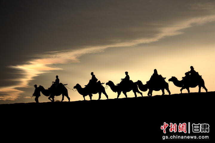 9月1日清晨,游客走進甘肅省敦煌市鳴沙山月牙泉景區(qū),乘騎駱駝欣賞大漠風光,體驗絲路風情。