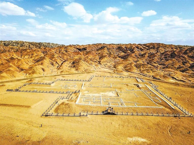下車步行,當(dāng)年氣勢(shì)恢宏的建筑物雖不復(fù)存在,但地面上的建筑輪廓以及職能機(jī)構(gòu)被標(biāo)注得很清晰。站在三危山新修建的觀景臺(tái)鳥瞰,懸泉置的風(fēng)貌便一覽無(wú)余。當(dāng)時(shí)懸泉置南依三危山余脈火焰山,北臨甜水井綠洲,是東西交往必經(jīng)之地,地理位置十分優(yōu)越。據(jù)記載,公元前138年、公元前119年,漢武帝兩次派張騫出使西域,首開其道,同時(shí)列四郡、據(jù)兩關(guān)、修長(zhǎng)城、設(shè)驛置,絲綢之路由此興起,至東漢中后期形成了“立屯田于膏腴之野,列郵置于要害之路。馳命走驛,不絕于時(shí)月;商胡販客,日款于塞下”,“臨西海以望大秦,拒玉門、陽(yáng)關(guān)者四萬(wàn)余里,靡不周盡”的巨大規(guī)模。