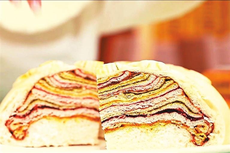 母親最拿手的還是做千層大月餅,做法與平常做饃有點不一樣,發(fā)好面后取適量揉好,切成同樣大小的若干份并搟壓成長方形的薄面皮。一層薄皮一層餡,餡料與烙的糖饃有的不一樣,重在色澤,每層分別抹上姜黃、紅曲、苦豆(香豆)粉、芝麻、菜籽油、糖玫瑰、葡萄干,黃、紅、黑、綠相間,一層黃一層綠一層紅一層黑,一層白糖一層紅糖一層玫瑰糖,一層一層摞好,做成一個六七層的圓餅。最后用薄皮蓋住一摞摞面皮,餅邊捏緊捏好后壓花塑形,表面用模型壓花,用專用做飯梳子一行行點上,或一行白鷺上青天,面皮如一塊畫布,精雕細琢,怎么好看怎么做,做得隨心所欲又精心設(shè)計。還會刷姜黃與菜籽油拌好的油料,撒上芝麻粒和葡萄干,一個千層餅就基本成型了。