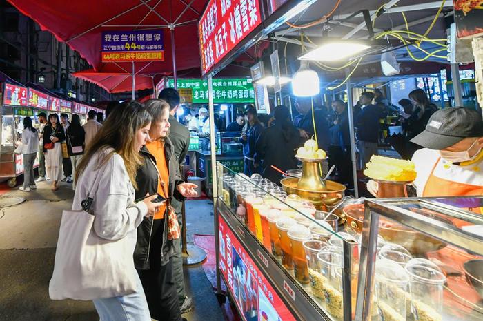 游客在蘭州市城關區(qū)正寧路小吃夜市選購特色美食。新華社記者 郎兵兵 攝