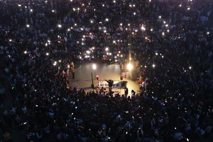 在蘭州市城關區(qū)的黃河蘭州段近水平臺,市民及游客參與“蘭州黃河大合唱”活動。新華社記者 范培珅 攝