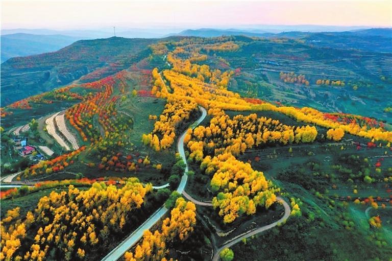 金秋時(shí)節(jié),這里秋葉五彩繽紛,黃得如金,綠得如玉,紅得如火,把秋姑娘打扮得格外妖嬈。一陣涼風(fēng)拂過,金黃的樹葉,搖曳著一把把小扇子,從空中飄飄而下,似乎在訴說著一個(gè)美麗的童話。村落散落在綿延數(shù)里的山腳下,村前屋后金色圍繞,梯田如鏈似帶、穿插交錯(cuò),如一幅幅線條簡潔明快的木刻版畫。