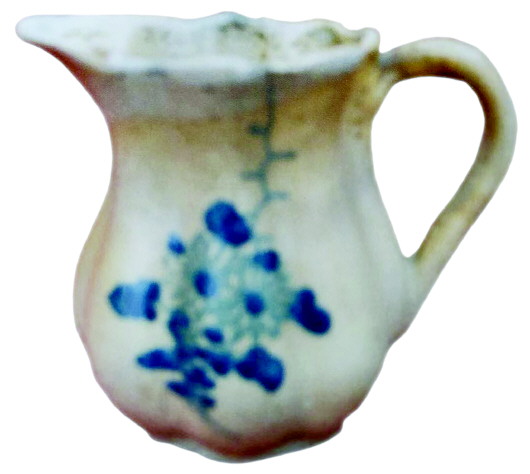 該口杯高10cm,上口手捏黏泥接連,珍珠釉澆注粘連處留有數(shù)滴珍珠釉淚珠??谘厍皟A,連口粘痕明顯裸露。通體呈吊南瓜分棱,八道指泥壕顯八股棱條。造型珍瓏靈秀,珍貴之處在于上施淺瑪瑙釉,體面使用藍(lán)寶石礦料畫一束盛開的菊花。畫筆嫻熟簡練,富有立體感,且活靈活現(xiàn)。在背面腰中部,用淡青花題“□□”二字,字雖模糊不清,但胎土細(xì)膩,瓷壁輕薄又堅硬如骨,胎底色黃中泛紅,瓷體表面青釉中又泛小針褐色點(diǎn)。把手處,窯變?yōu)轵球咀吣嗉y。這種泥紋,沉重古樸,明亮而深沉,是釉層在干燥或燒成時發(fā)生干裂,后在高溫階段又有釉流入填補(bǔ)而形成的。在民國以前,蚯蚓紋曾被作為判斷鈞釉的唯一標(biāo)準(zhǔn)。