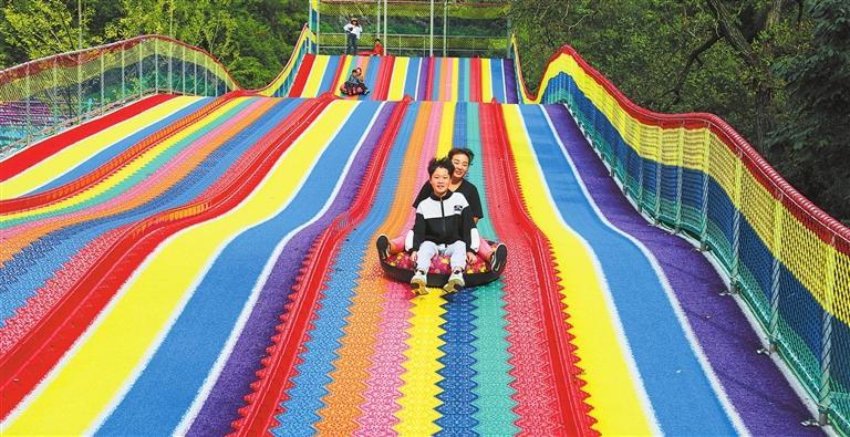 10月2日,游客在隴南市武都區(qū)五馬“網(wǎng)紅”童話小鎮(zhèn)體驗(yàn)彩虹滑道。新甘肅·甘肅日?qǐng)?bào)通訊員 李旭春