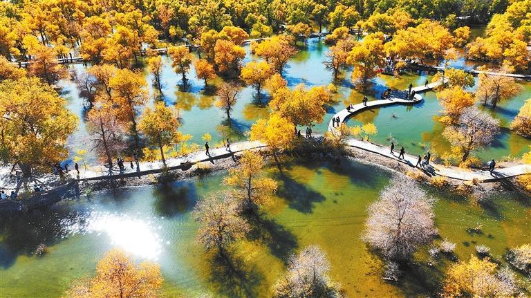 10月2日,游客在金塔沙漠胡楊林景區(qū)欣賞胡楊美景。新甘肅·甘肅日?qǐng)?bào)通訊員 曹紅祖