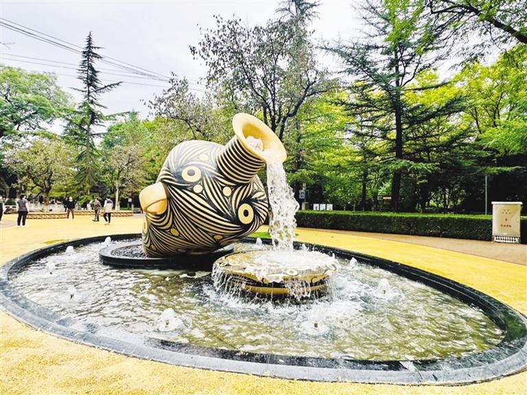 走進公園(東口),入口處以“大河厚土孕彩陶”為主題的彩陶墻格外顯眼,墻上鑲嵌著不同造型和樣式的彩陶,分別介紹了大地灣文化彩陶、仰韶文化彩陶、馬家窯文化彩陶、齊家文化彩陶四個不同歷史發(fā)展時期。沿健身步道向西行進,體量巨大的馬家窯旋紋彩陶尖底瓶正向旋紋彩陶盆內(nèi)倒入“黃河之水”,這一景觀便是“彩陶流水”節(jié)點,景觀造型采用跌水、涌泉的形式,打造出彩陶流水的動態(tài)效果,象征著黃河文化的源遠流長。