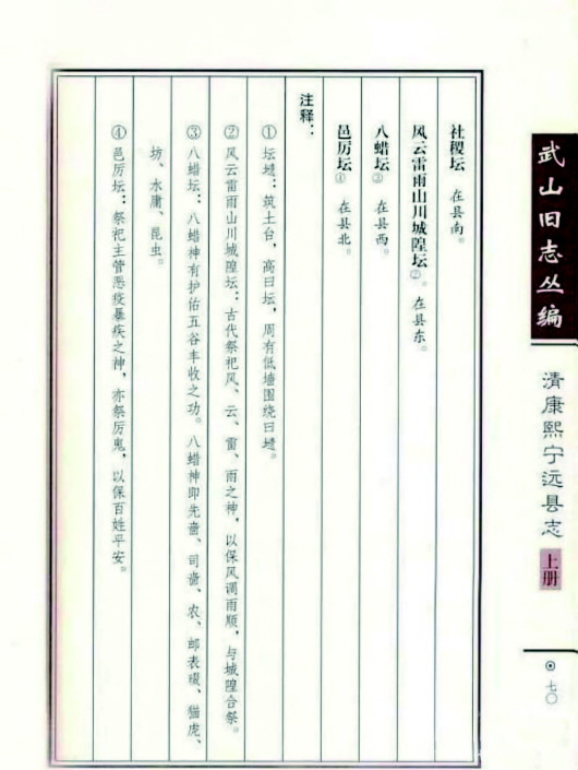 《清康熙寧遠縣志》也有記載:“風(fēng)云雷雨山川城隍壇,在縣東。古代祭祀風(fēng)、云、雷、雨之神,以保風(fēng)調(diào)雨順,與城隍合祭。”“風(fēng)云雷雨壇”:“在城東郊外,祭用春秋二仲上巳日,設(shè)三壇,風(fēng)云雷雨居中,山川居左,城隍居右,陳設(shè)與社稷同,城隍廟與風(fēng)云雷雨壇合祭。”