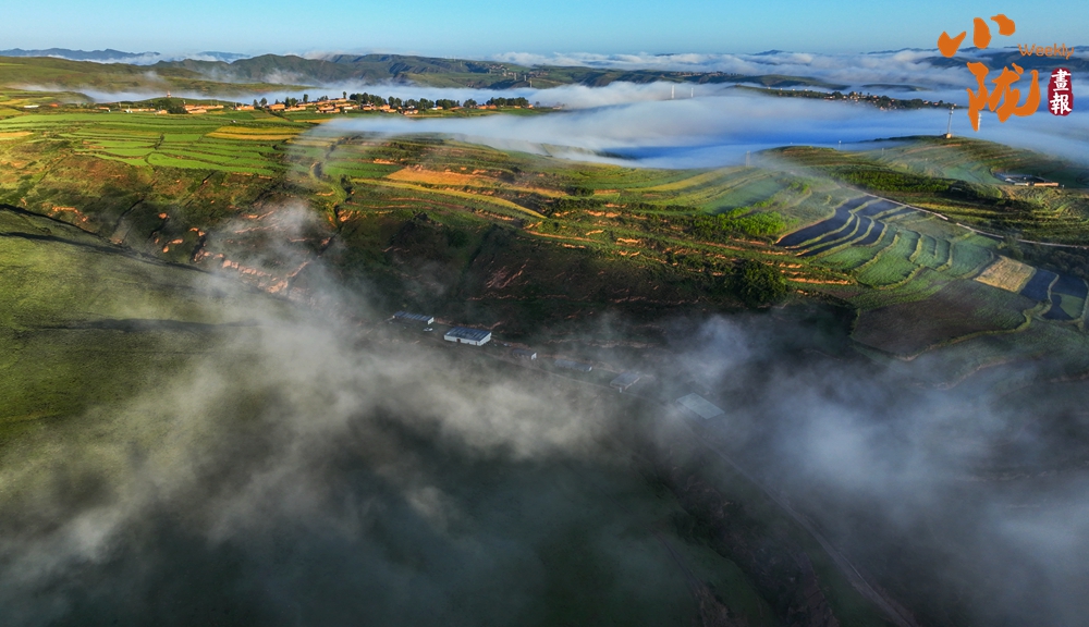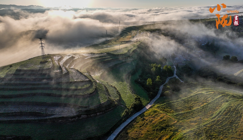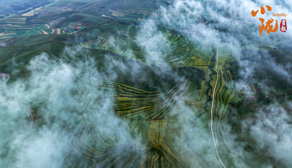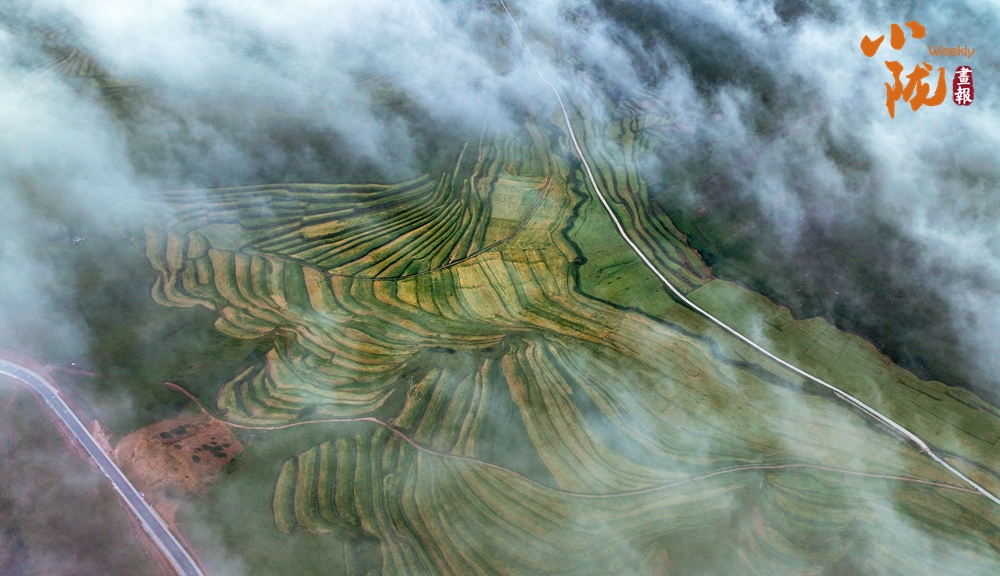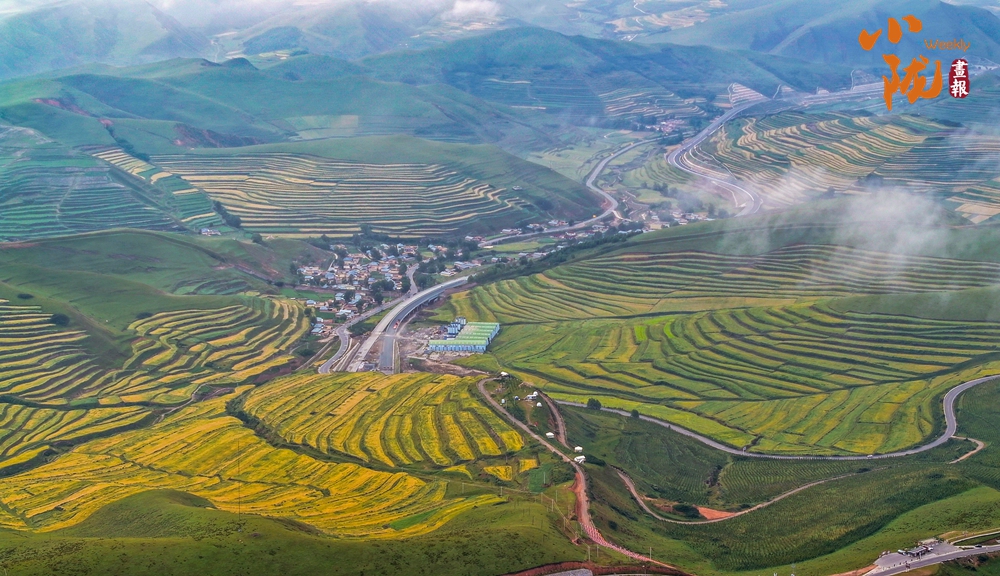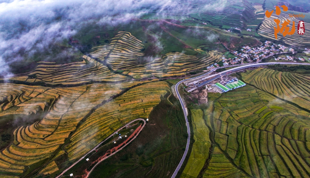 一場(chǎng)秋雨過后,甘南臨潭連綿的群山被云霧籠罩,星羅棋布的梯田上迎來(lái)收獲期,稻浪滾滾,美不勝收。