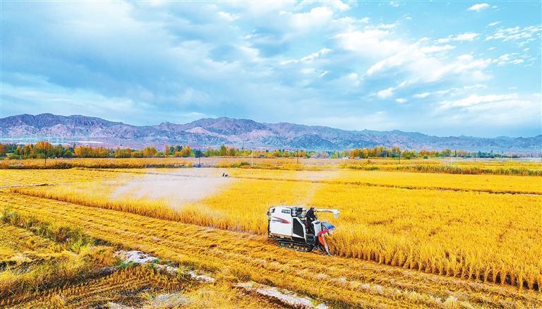 張掖市甘州區(qū)烏江鎮(zhèn)大灣村2000多畝稻田一片金黃,村民正在進(jìn)行搶收作業(yè)。新甘肅·甘肅日?qǐng)?bào)通訊員 楊瀟