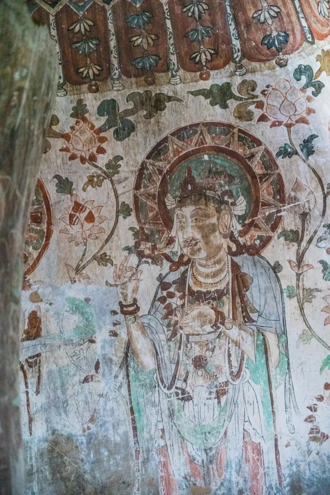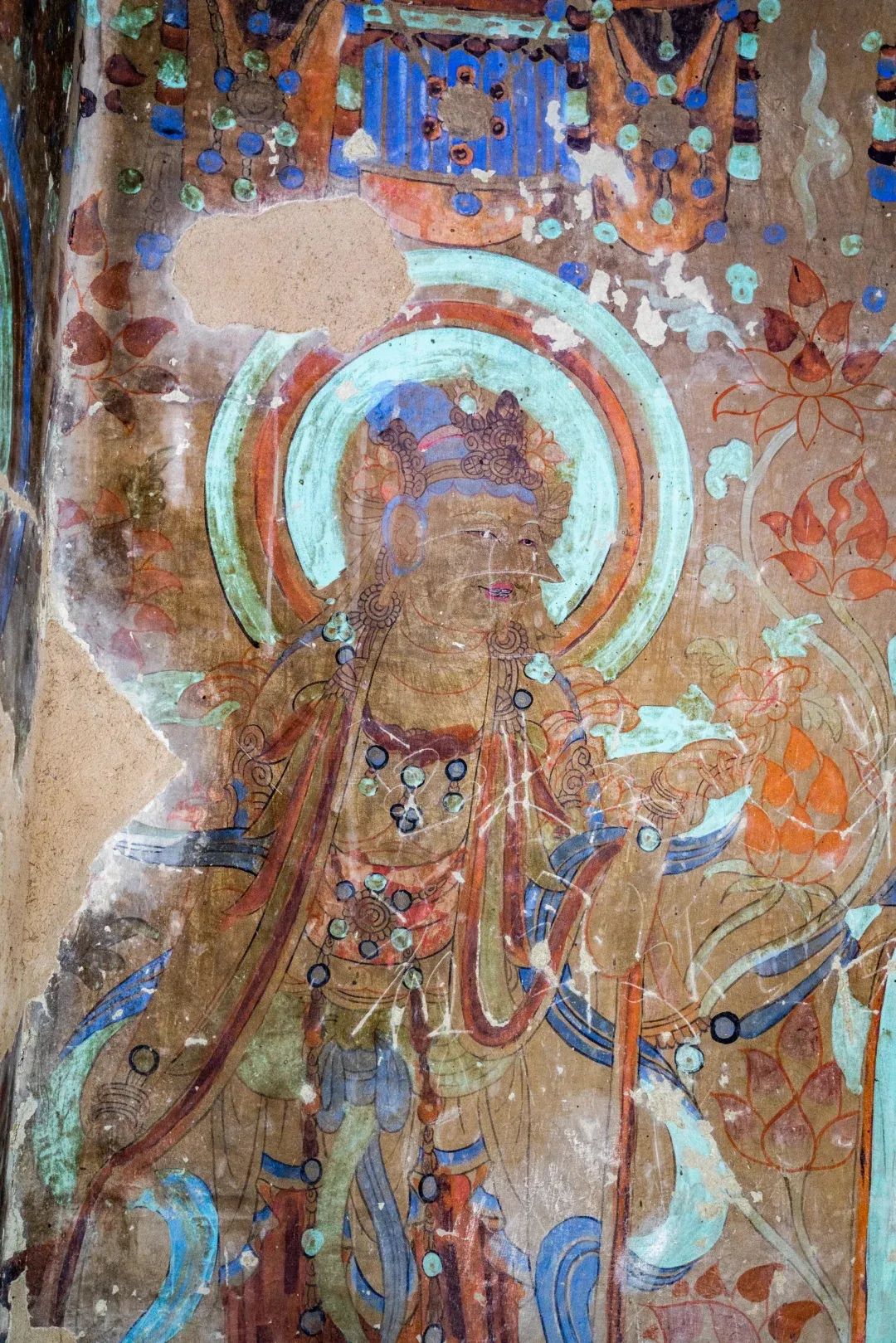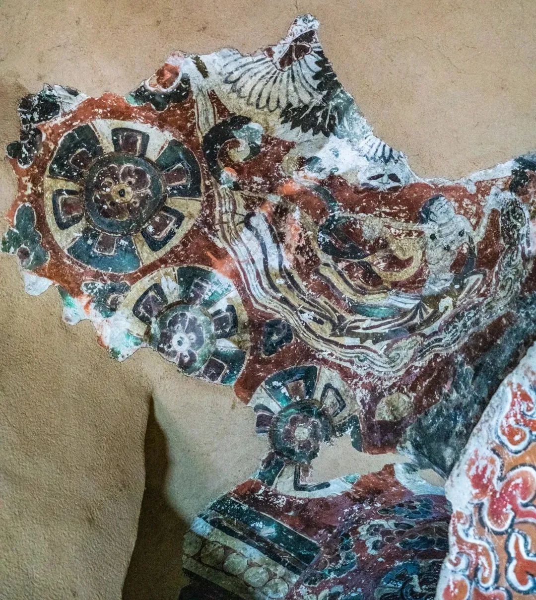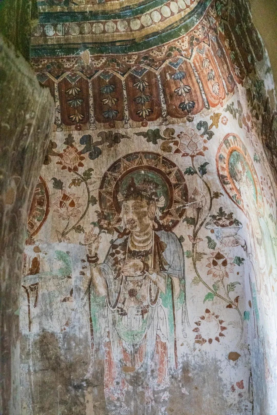 昌馬石窟第4窟洞窟形制及其殘存的塑像對(duì)于研究中國早期石窟藝術(shù)與佛教造像藝術(shù)極其重要??邇?nèi)壁畫內(nèi)容是四壁上方畫條式旌幡,下畫供養(yǎng)菩薩,身高近2米,今殘存20身,菩薩周圍畫纏枝蓮,與第二窟基本相同??唔斍鞍氩康卣檀蟛糠置撀?,靠近中心柱正面上部右側(cè)的部位殘存龜形六瓣團(tuán)花圖案與一身飛天及菊花紋圖案。后部中心柱頂部周圍窟頂表面繪龜形六瓣團(tuán)花、連珠紋等圖案。
