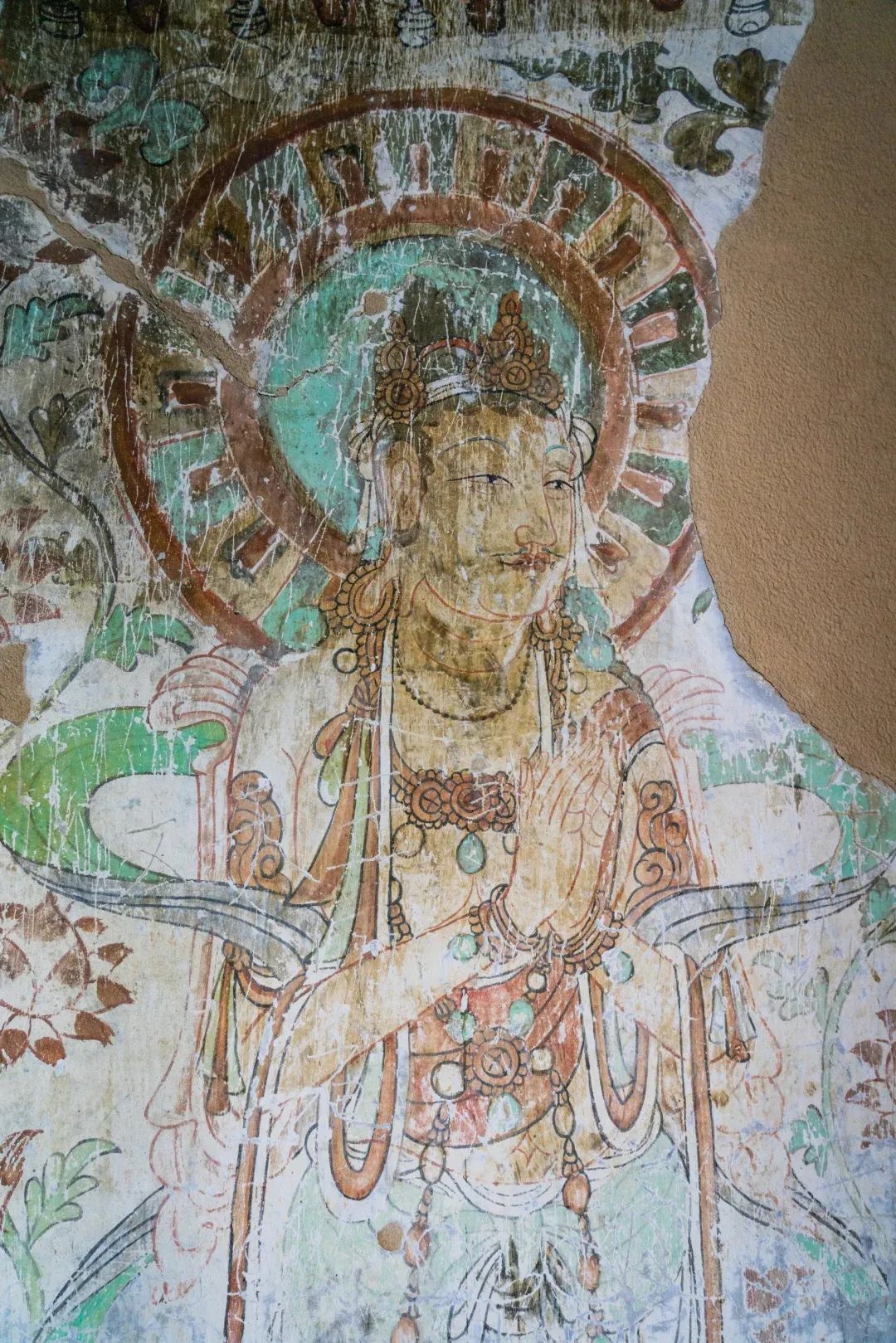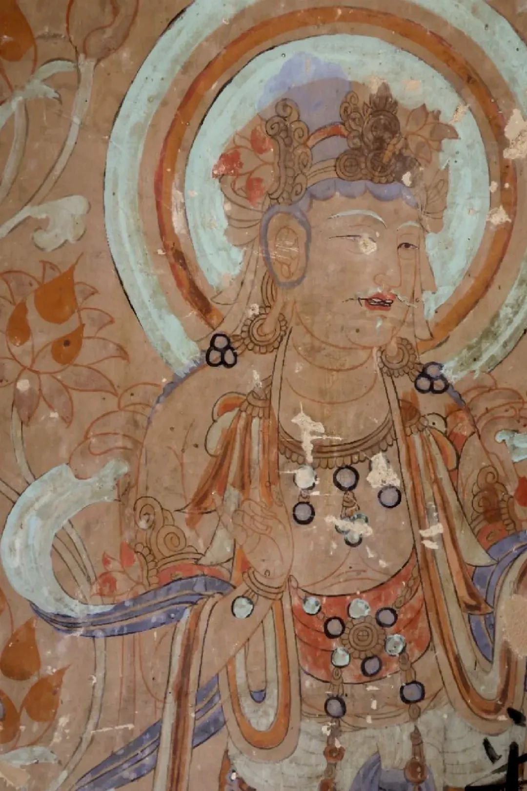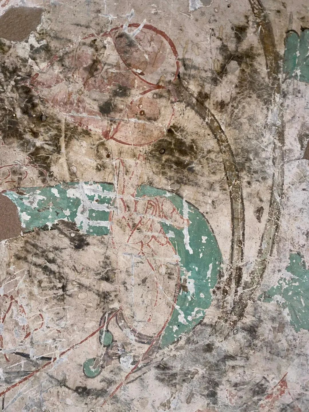 昌馬石窟第4窟洞窟形制及其殘存的塑像對(duì)于研究中國早期石窟藝術(shù)與佛教造像藝術(shù)極其重要??邇?nèi)壁畫內(nèi)容是四壁上方畫條式旌幡,下畫供養(yǎng)菩薩,身高近2米,今殘存20身,菩薩周圍畫纏枝蓮,與第二窟基本相同??唔斍鞍氩康卣檀蟛糠置撀?,靠近中心柱正面上部右側(cè)的部位殘存龜形六瓣團(tuán)花圖案與一身飛天及菊花紋圖案。后部中心柱頂部周圍窟頂表面繪龜形六瓣團(tuán)花、連珠紋等圖案。
