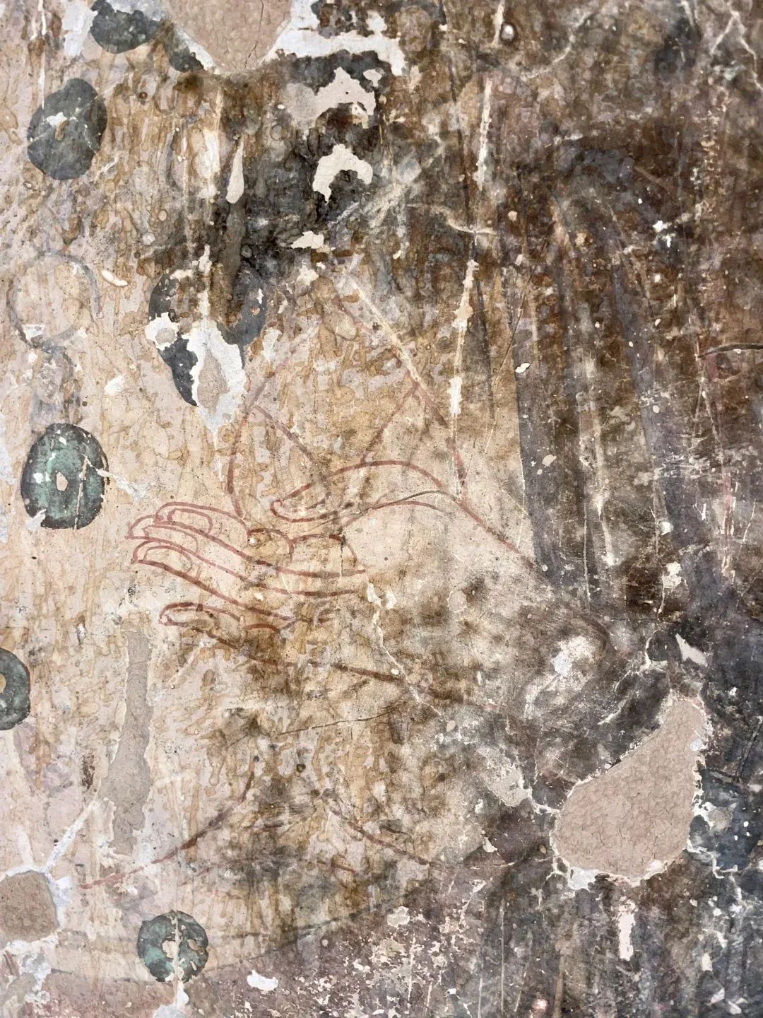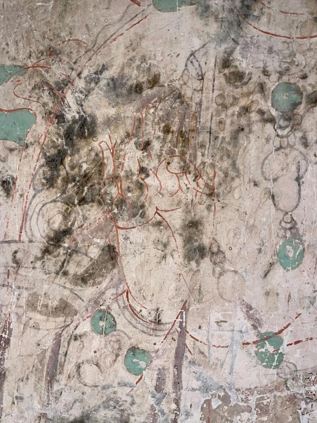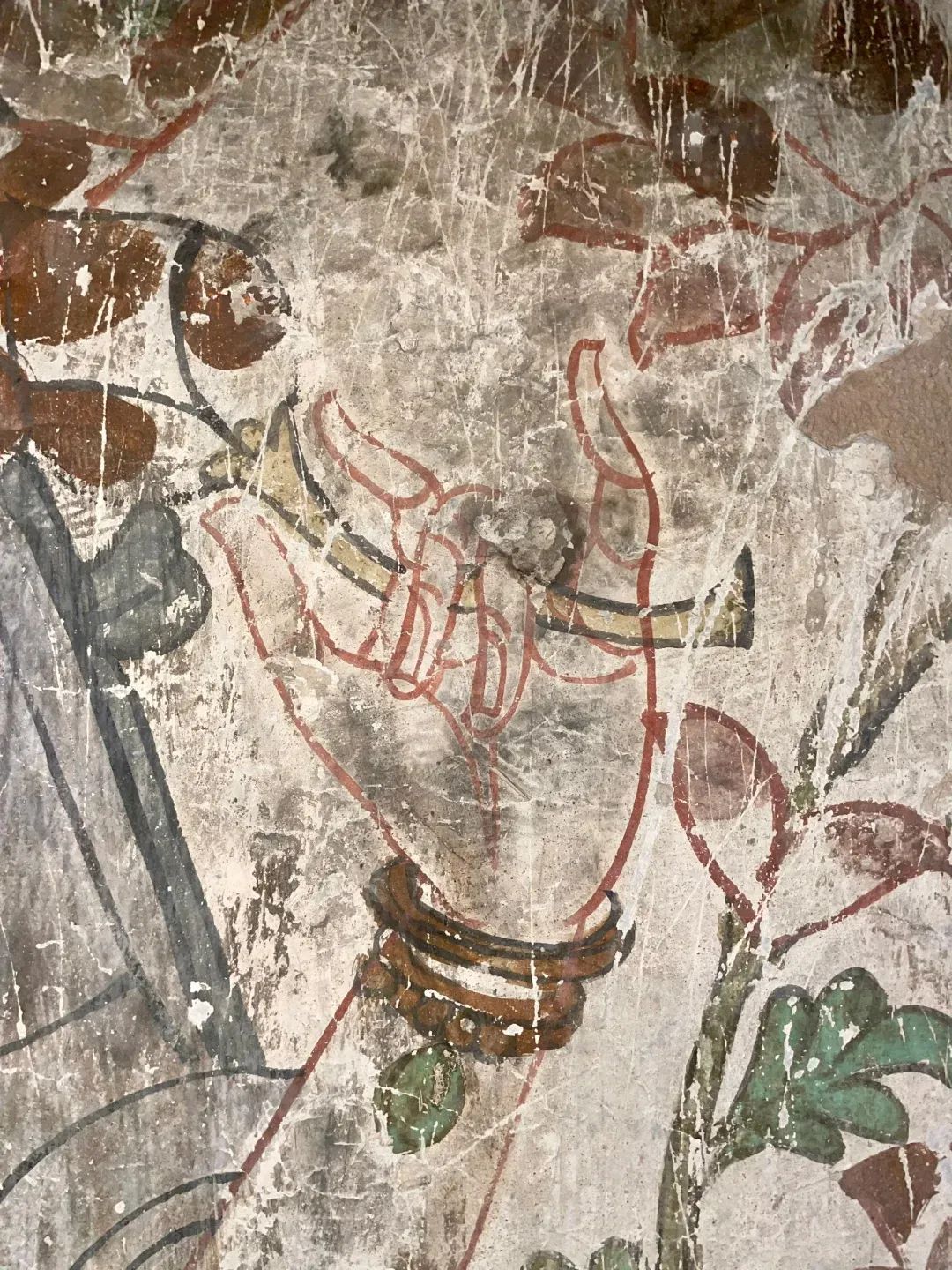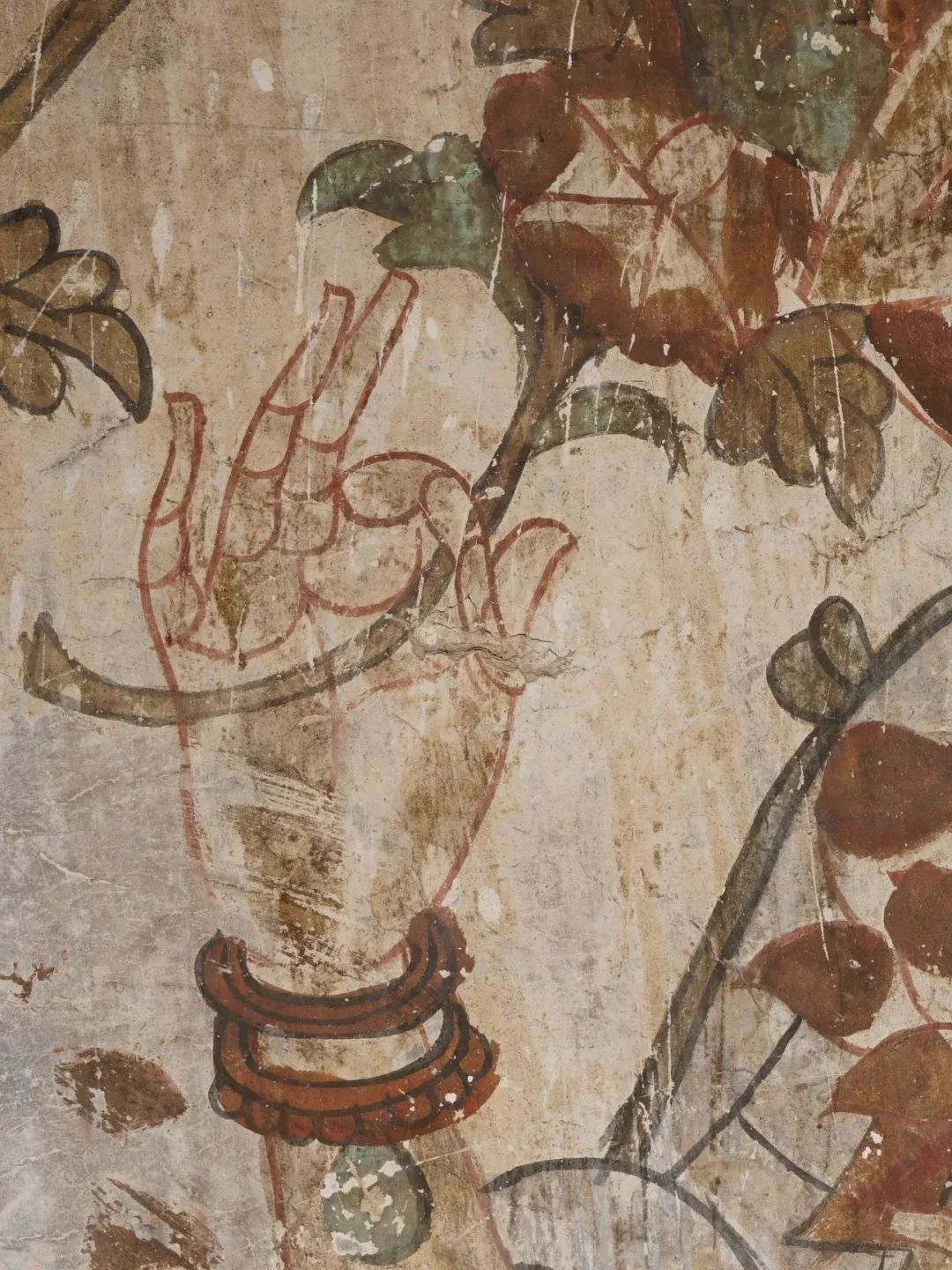 昌馬石窟第4窟洞窟形制及其殘存的塑像對(duì)于研究中國早期石窟藝術(shù)與佛教造像藝術(shù)極其重要??邇?nèi)壁畫內(nèi)容是四壁上方畫條式旌幡,下畫供養(yǎng)菩薩,身高近2米,今殘存20身,菩薩周圍畫纏枝蓮,與第二窟基本相同??唔斍鞍氩康卣檀蟛糠置撀?,靠近中心柱正面上部右側(cè)的部位殘存龜形六瓣團(tuán)花圖案與一身飛天及菊花紋圖案。后部中心柱頂部周圍窟頂表面繪龜形六瓣團(tuán)花、連珠紋等圖案。