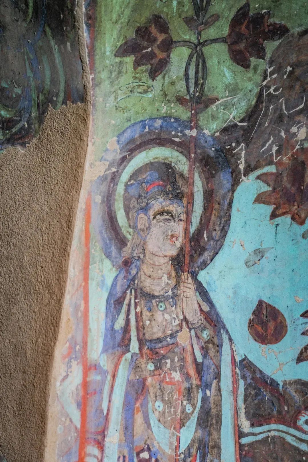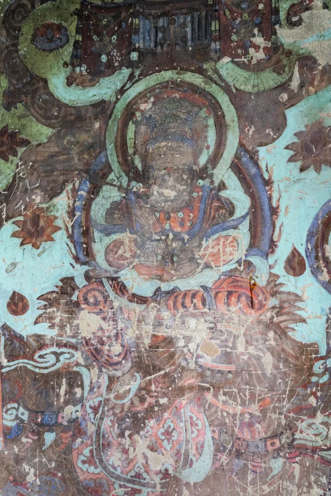 現(xiàn)在第4窟中早期塑像多數(shù)已毀,但仍殘存少數(shù)幾身,十分珍貴;各側(cè)面表層為西夏重修時(shí)繪制的壁畫;柱座與柱身的兩層自下而上逐層縮??;中心柱正面在西夏時(shí)改造成一橢圓形的大背屏,背屏正面表層為清代重繪的壁畫;四壁及頂上壁畫也多為西夏時(shí)期。