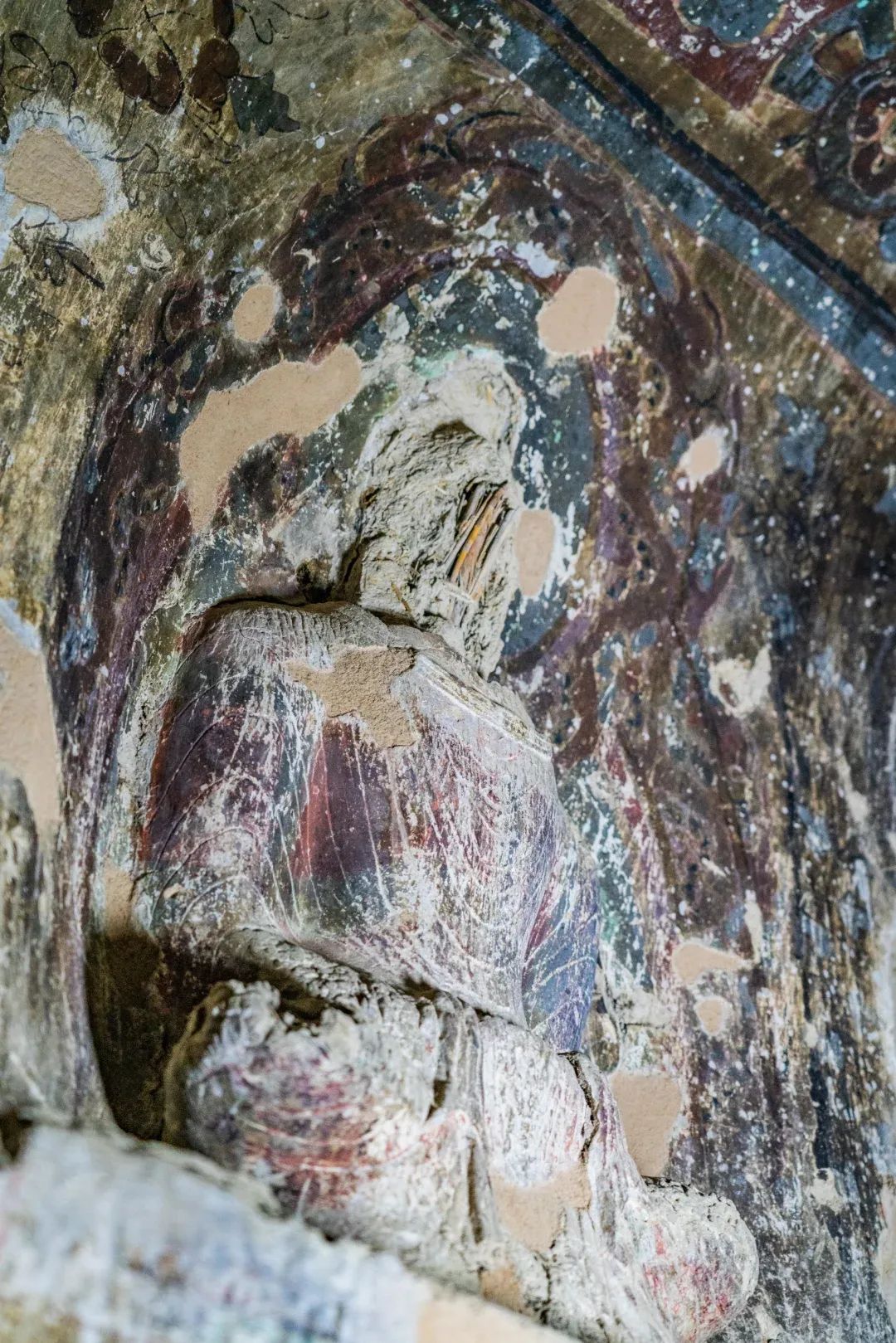 塑像題材為簡單的一佛二菩薩。內(nèi)塑一坐佛像,龕外兩側(cè)各塑一脅侍菩薩像,上層開—淺龕,中間塑一結(jié)跏趺坐佛像,面相渾圓,雙手?jǐn)n于袈裟內(nèi),衣角垂于腹前,陰線刻衣紋。頭部均毀,露出麥草扎成的骨干。龕外兩側(cè)各塑一脅侍菩薩像,雙手合十,佩項(xiàng)圈、瓔珞,披帛搭于肩上,帛帶下垂外張。佛與菩薩,作風(fēng)古樸,技法概括而又簡練,很接近敦煌莫高窟259窟,其時(shí)代可能為北涼時(shí)期。