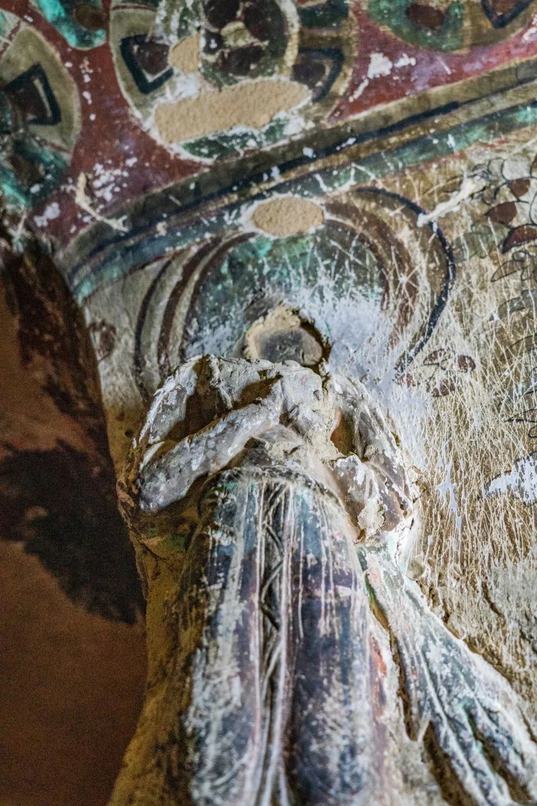 昌馬石窟所在的玉門地區(qū)是古代絲綢之路的必經(jīng)之地,也是佛教?hào)|傳的必經(jīng)之地。早期從印度或西域傳來的佛教造像風(fēng)格在昌馬石窟中也有所反映。第4窟中心柱上層的坐佛塑像采用的在胸前及手臂表面呈連續(xù)相疊的“U”字形下垂的陰線刻衣紋的形式,我們?cè)诙鼗湍呖叩?59窟與馬蹄寺石窟千佛洞第2窟等處的坐佛塑像身上都可以見到,這種貼體的袈裟表面陰刻規(guī)整衣紋的形式是受到印度笈多造像藝術(shù)影響的產(chǎn)物。