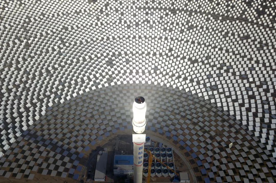 人們驚呼,這是自然力與人類智慧的完美創(chuàng)造:戈壁荒灘上“種”出了人造太陽。這個100兆瓦熔鹽塔式光熱電站,占地面積相當于780個足球場,每年所生產(chǎn)的綠電可減排35萬噸二氧化碳。