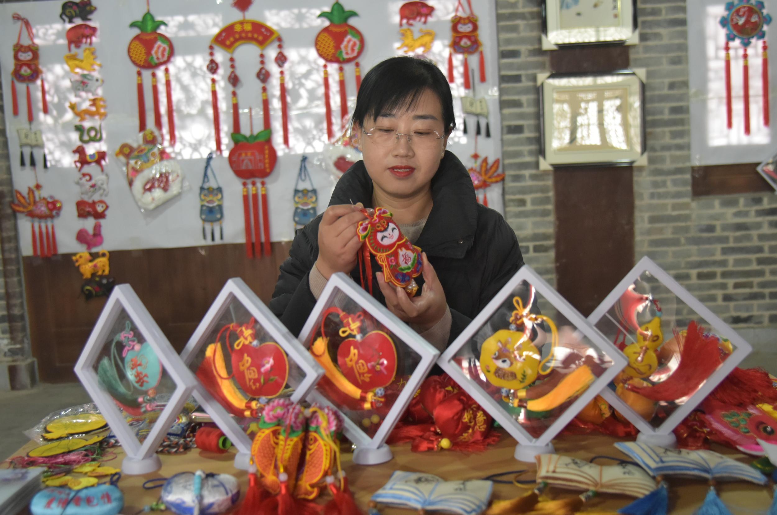 除了剪紙,鎮(zhèn)原縣香包、刺繡、書法等傳統(tǒng)文化藝術(shù)氛圍也很濃厚,深受廣大群眾喜愛。在文化一條街,十幾家書畫、香包、刺繡工作室緊挨,組成了一條文化長廊,除了銷售文創(chuàng)產(chǎn)品外,還承擔(dān)著非遺文化傳承和技藝培訓(xùn),熱鬧而又成氣候。“作為一名非遺傳承人,不僅要把自己的香包刺繡產(chǎn)品設(shè)計(jì)好、做精致,更重要的是要把這門技藝教給更多的人,讓香包、刺繡這門技藝更好地傳承下去。”慶陽香包刺繡非物質(zhì)文化遺產(chǎn)傳承人任艷艷說,自己在文化一條街已經(jīng)開店近十年了,帶出了很多巧媳婦巧婆婆,還不時(shí)受邀在縣內(nèi)外進(jìn)行培訓(xùn)指導(dǎo)。