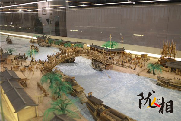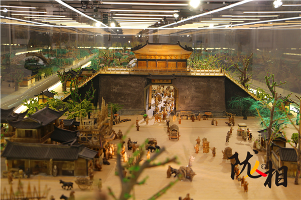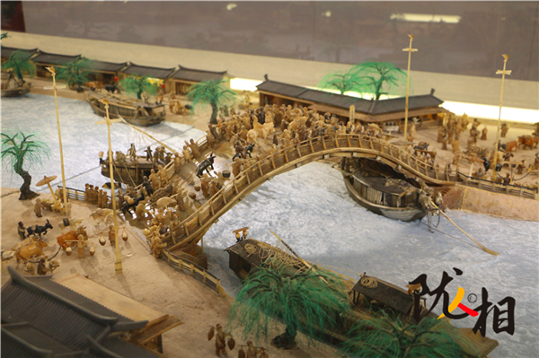 劉金祿歷時25年創(chuàng)作的白牦牛角微雕版《清明上河圖》,長16米,寬1.6米,共微雕人物1460名,動物300余頭、房間400余間、大小船只30余艘、牛馬車輛50余輛。小到杯盞酒蝶,大到雕梁畫棟,都有生動刻畫,徹底將《清明上河圖》由平面畫作搬上了立體展臺。